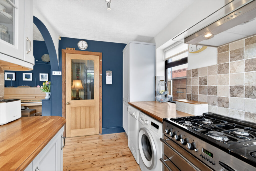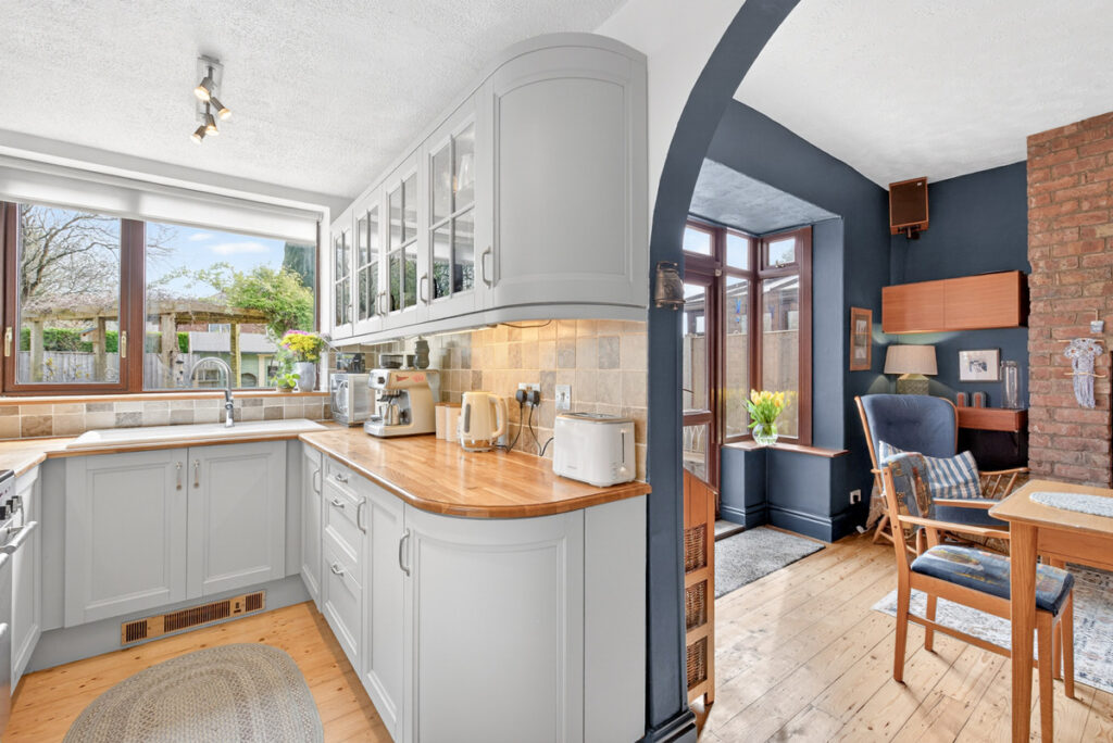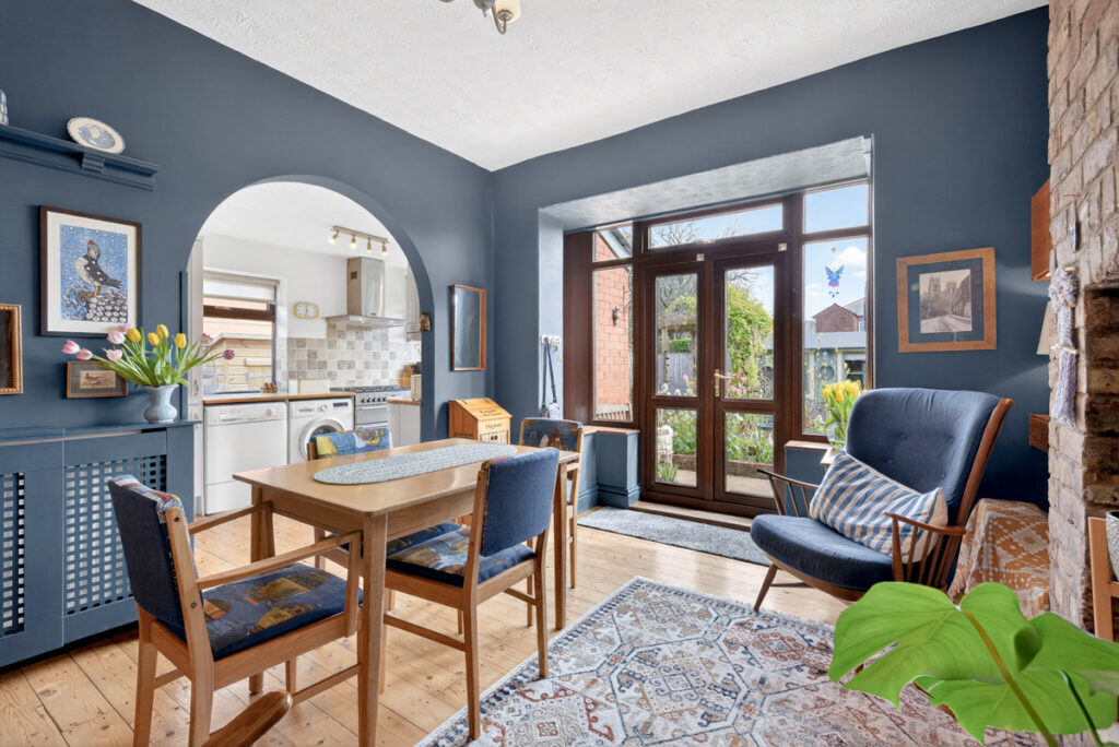 Beautifully presented and wonderfully cosy, the home retains a traditional ground‑floor layout with two reception rooms and a kitchen. The wall between the kitchen and second reception room has been removed to create a superb open‑plan family space, seamlessly combining cooking, dining, and living areas. French doors open directly onto the garden, allowing natural light to pour in and providing an ideal setting for entertaining.