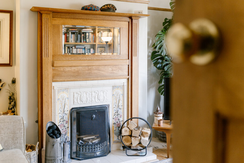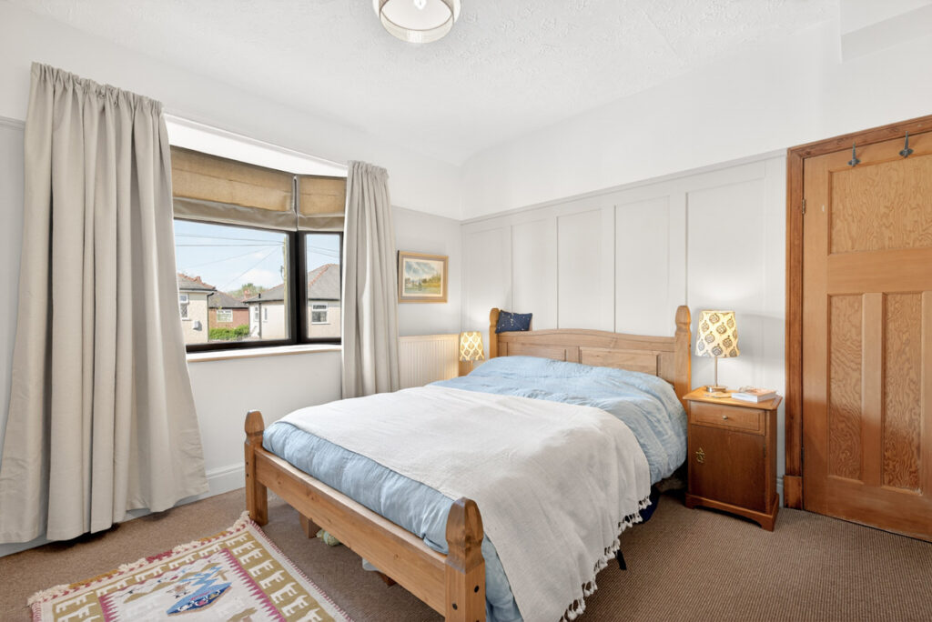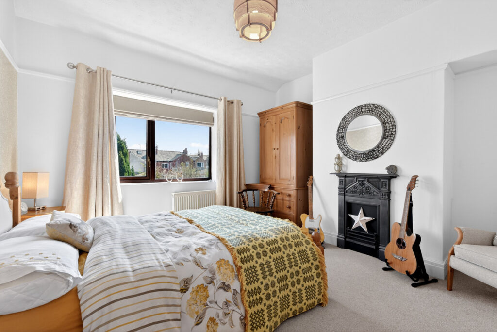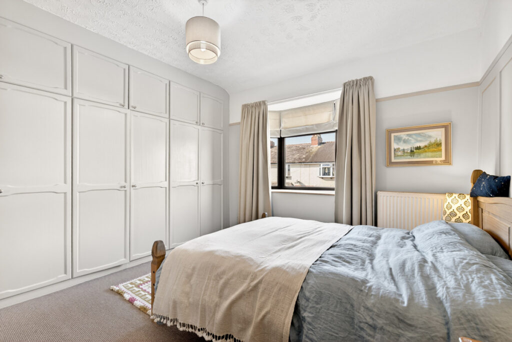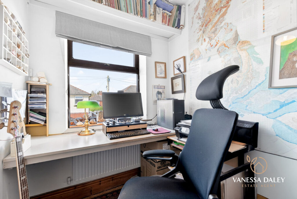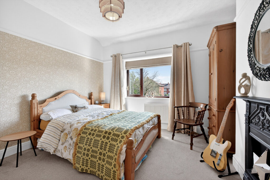 Upstairs, there are two double bedrooms, a single bedroom, and a family bathroom. The main bedroom benefits from extensive fitted wardrobes along one wall, while contemporary wall panelling adds a modern touch. The second bedroom enjoys a lovely view over the garden and features a cast‑iron fireplace. The third bedroom is currently arranged as a home office but can easily serve as a single bedroom.