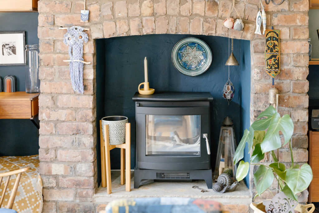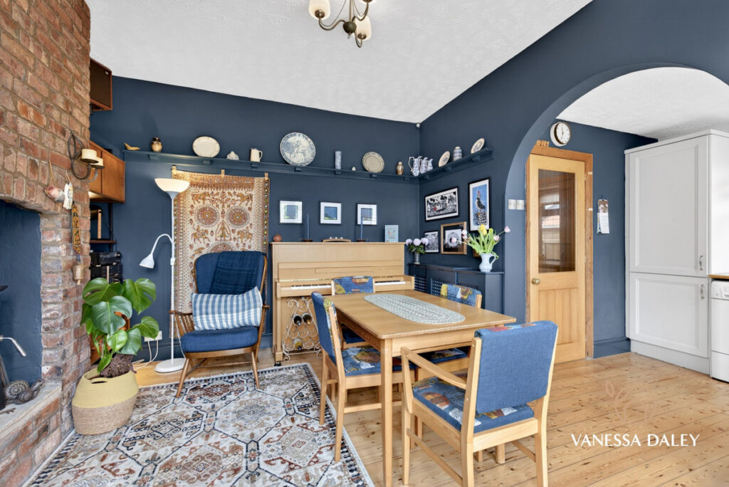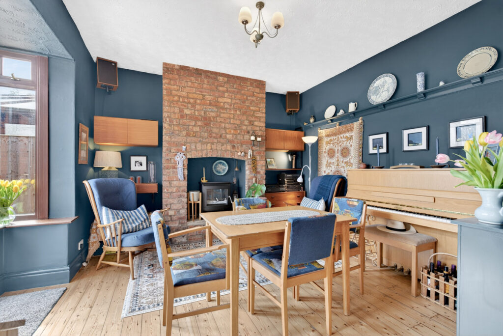 The kitchen, finished in an attractive duck‑egg blue, features original stripped wooden flooring, a Range gas cooker, an integrated fridge‑freezer, and space for a washing machine. An open archway leads into the dining area, which flows into a welcoming living space complete with a charming red‑brick chimney breast and electric stove.