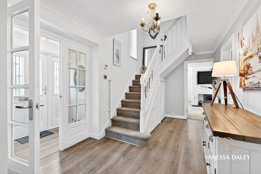 A home of exceptional character, this property offers a collection of distinctive features designed to impress even the most discerning buyer. Perfectly positioned along a tranquil, tree‑lined cul‑de‑sac, it enjoys a secluded and highly desirable setting. A long private driveway and a detached double garage provide parking for up to six vehicles, making it ideal for multi‑generational living or households with multiple cars.