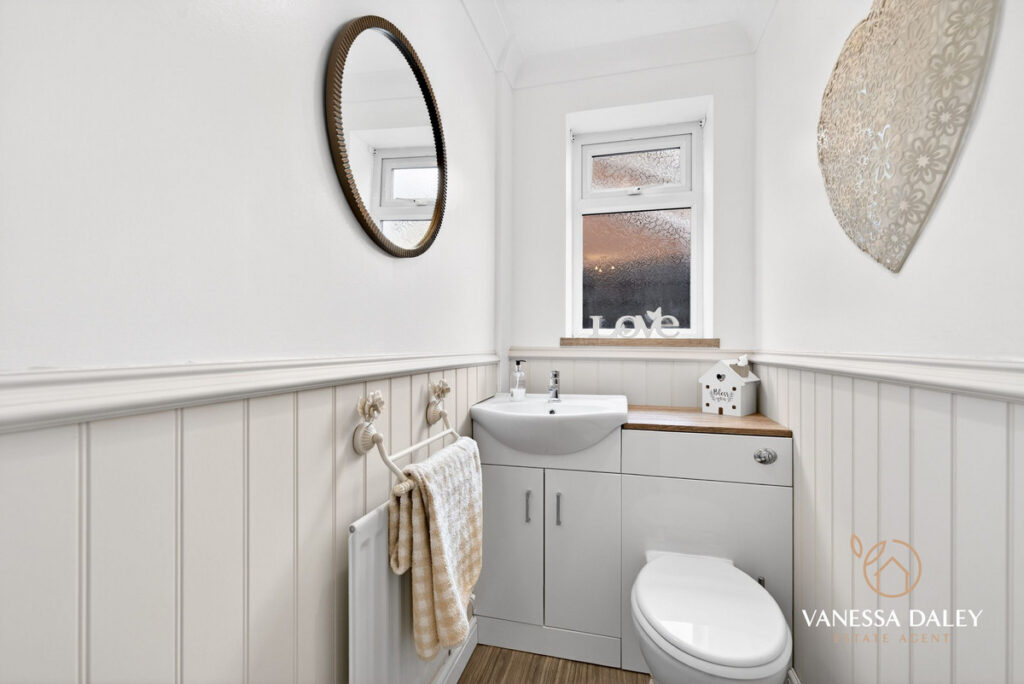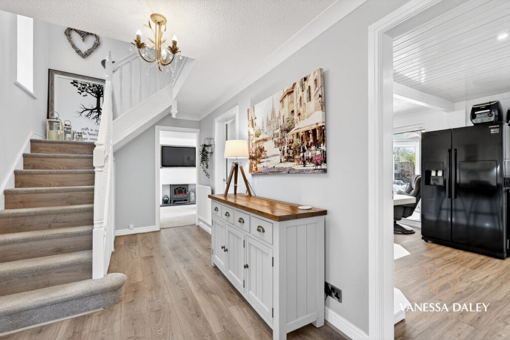 Both the front and rear outlooks are picturesque, enhancing the sense of privacy and calm created by the surrounding greenery. The central hallway is wide and welcoming, with access to the living room, study, and the family dining kitchen and Orangery to the rear. A ground‑floor WC and a separate utility room add further convenience.