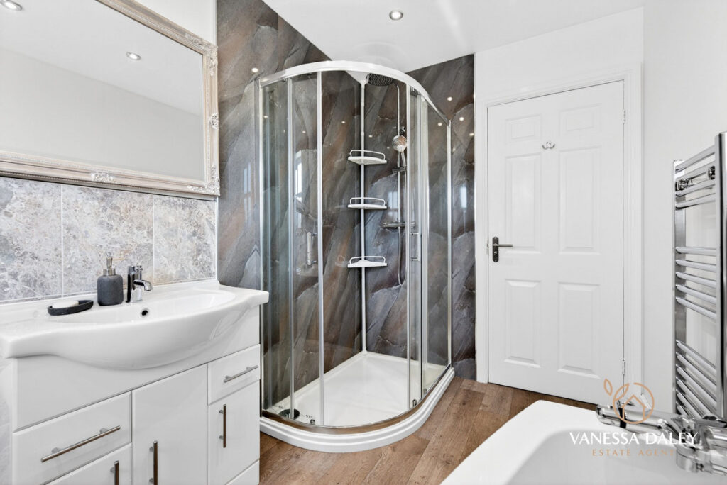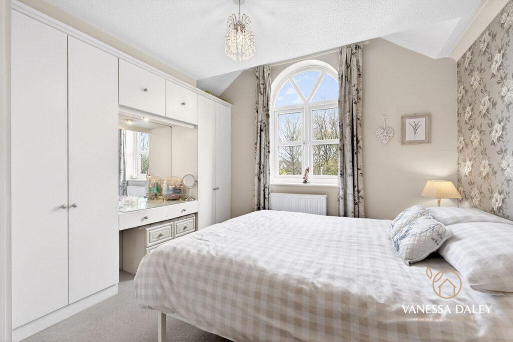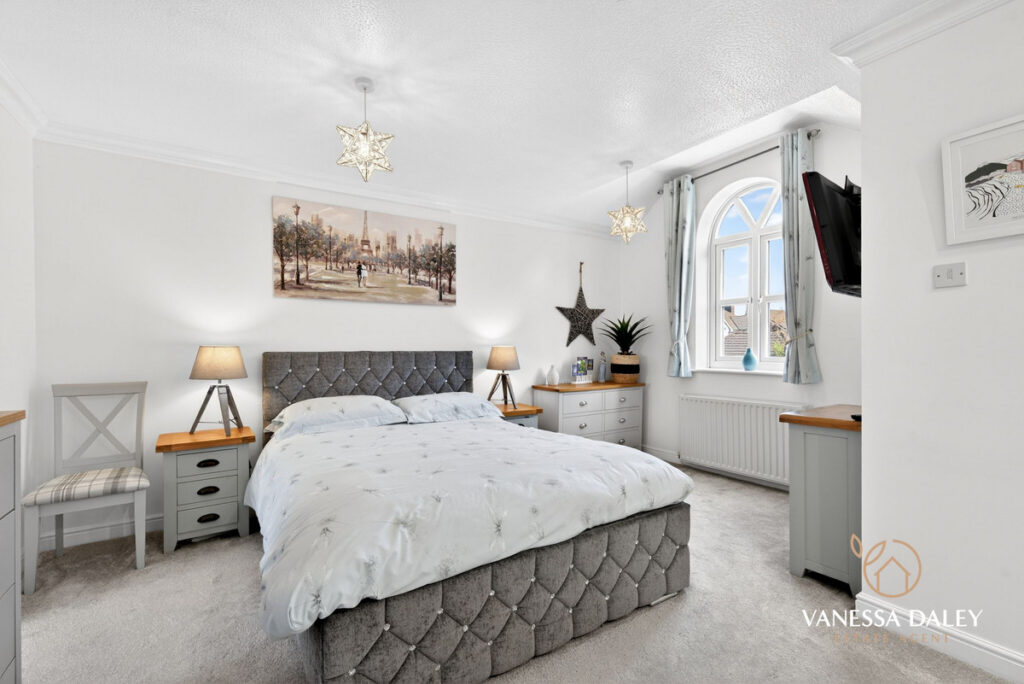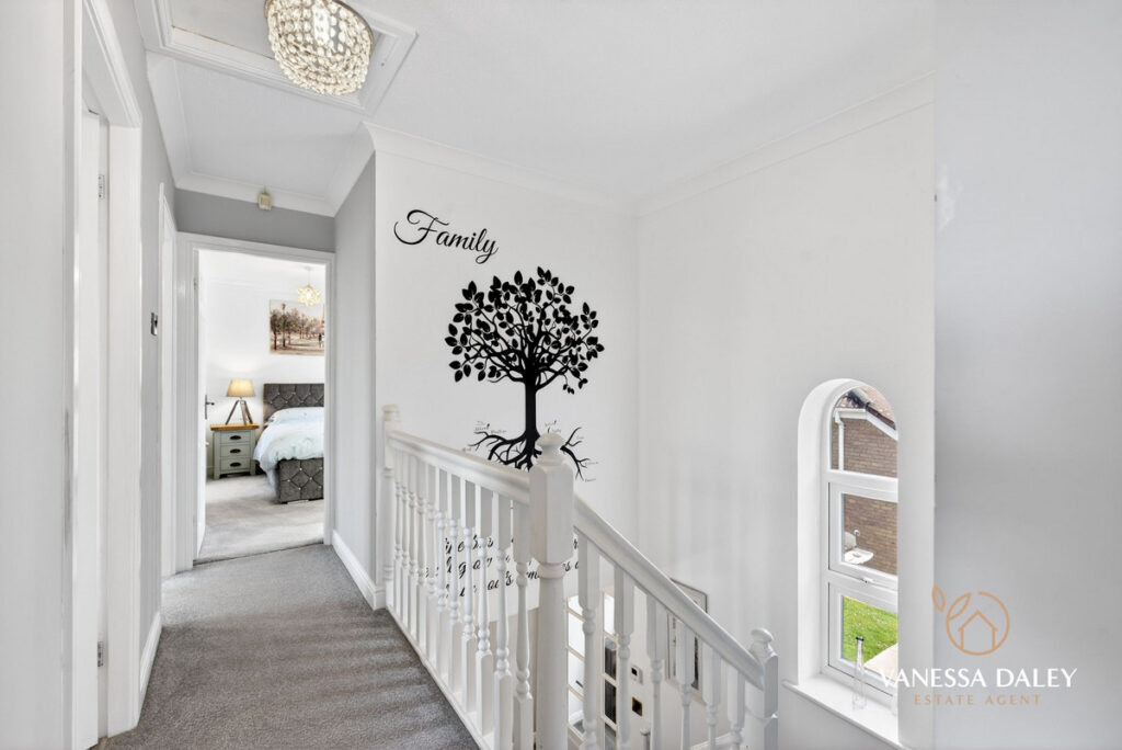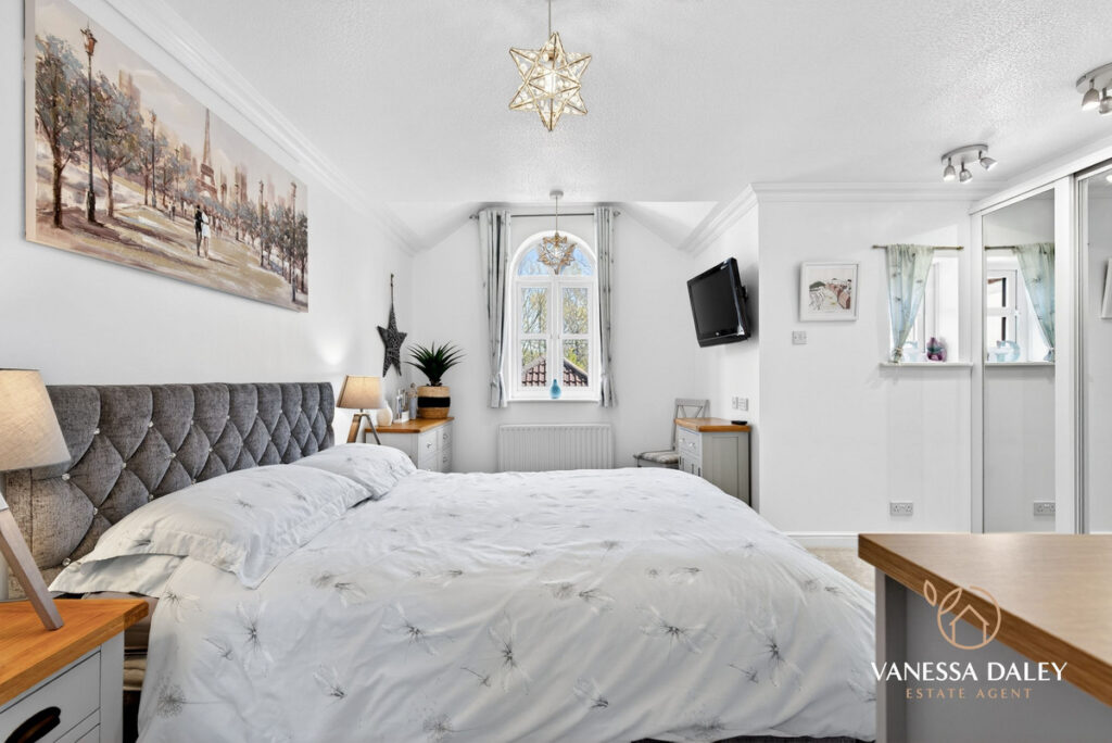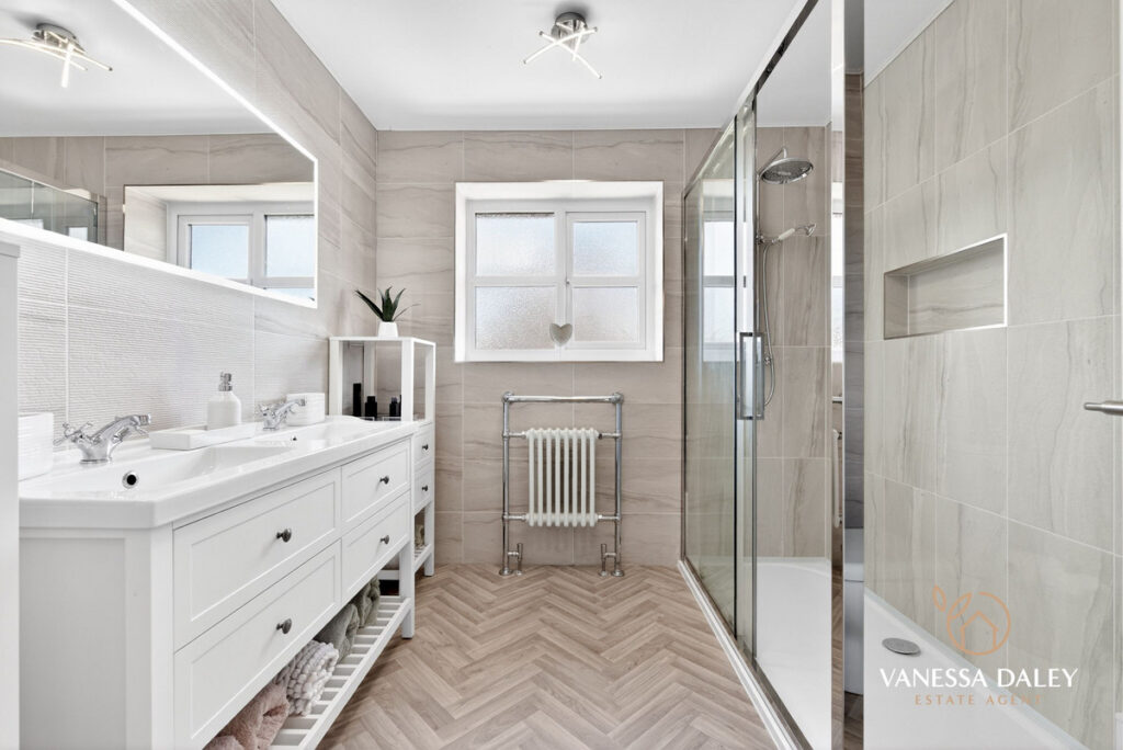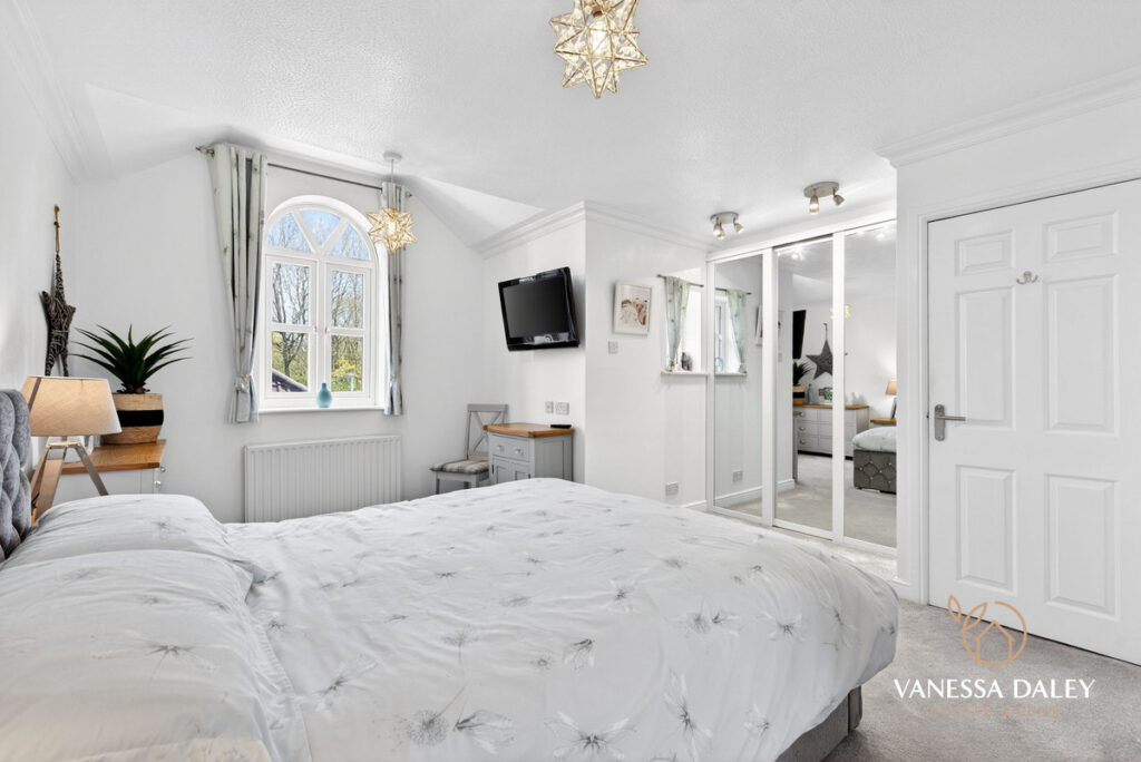 Upstairs, the bright and generous landing leads to four double bedrooms. The principal bedroom is particularly spacious, featuring mirrored wardrobes, a charming arched window with a pleasant view, and a well‑appointed en‑suite with double sinks and a large step‑in shower.