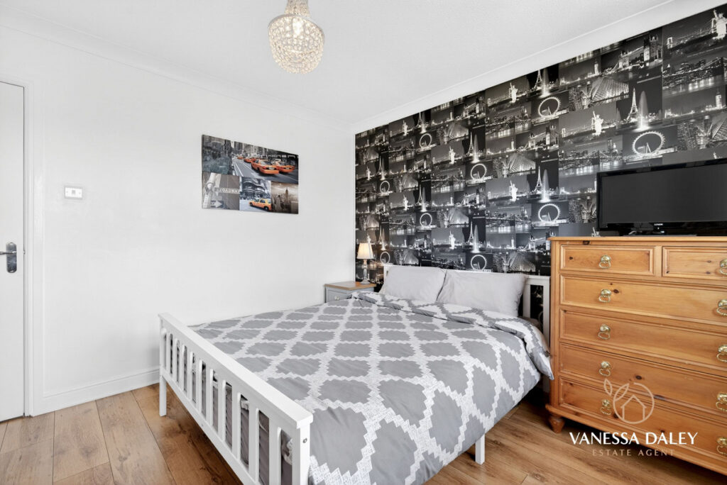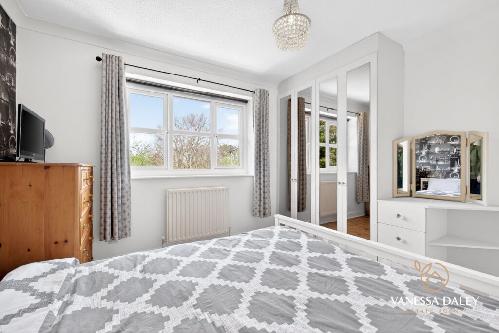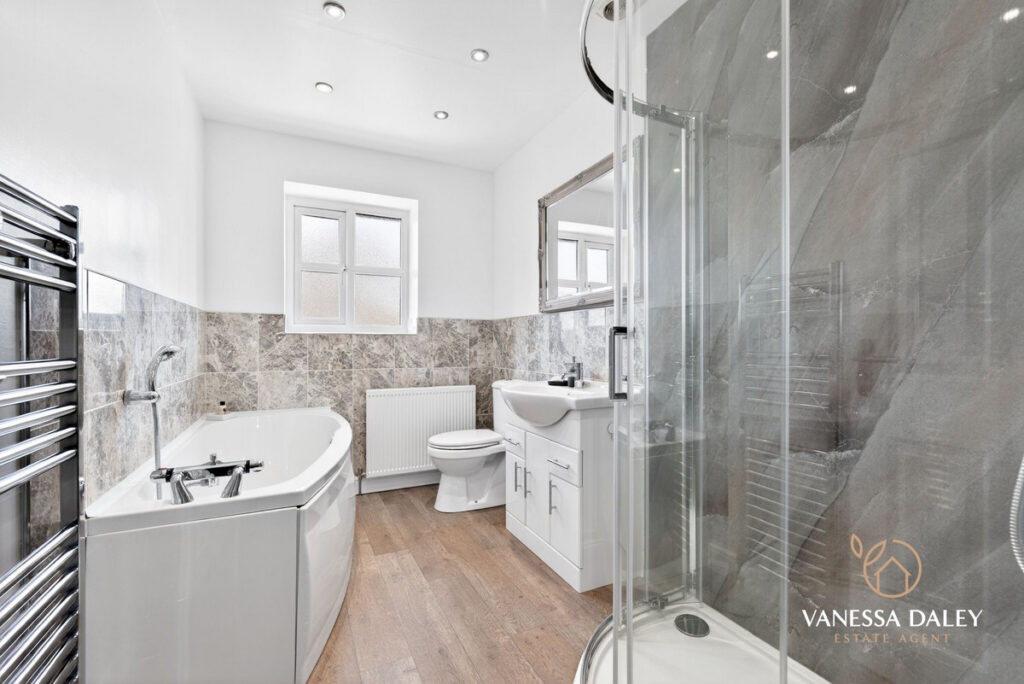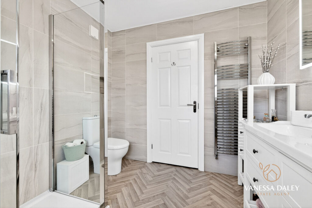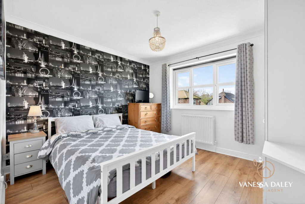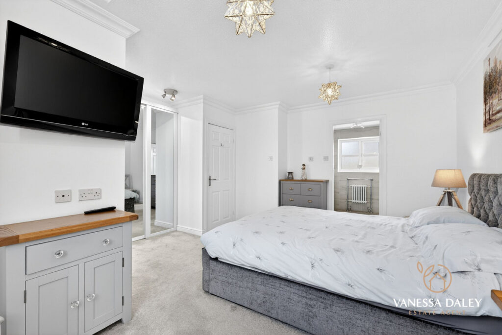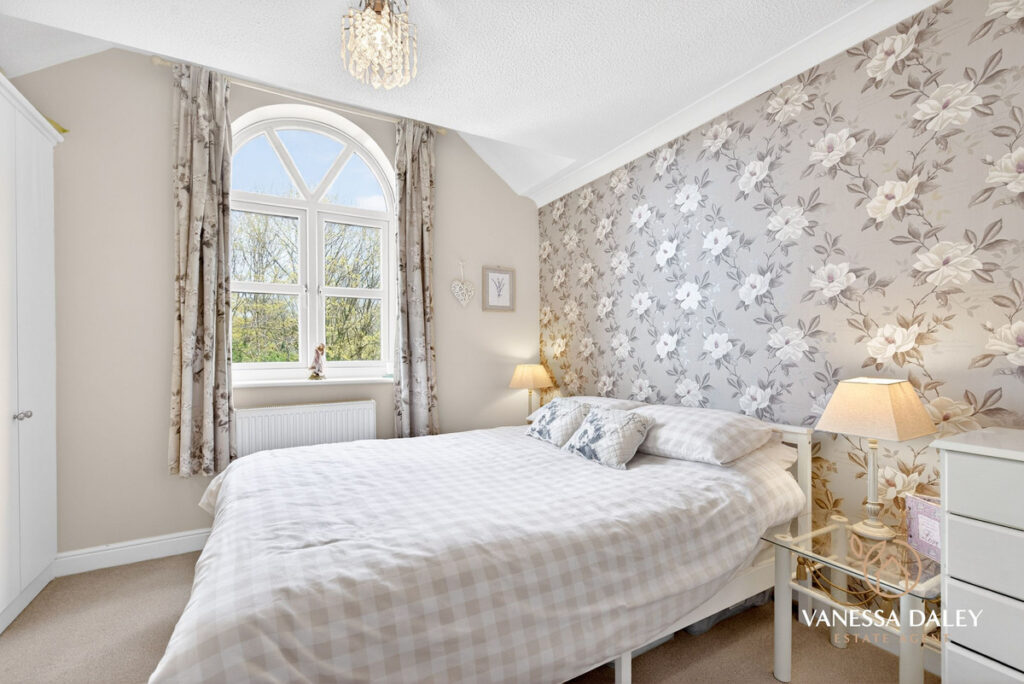 Upstairs, the bright and generous landing leads to four double bedrooms. The principal bedroom is particularly spacious, featuring mirrored wardrobes, a charming arched window with a pleasant view, and a well‑appointed en‑suite with double sinks and a large step‑in shower.