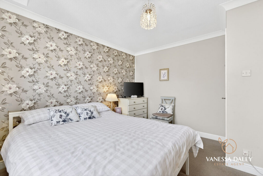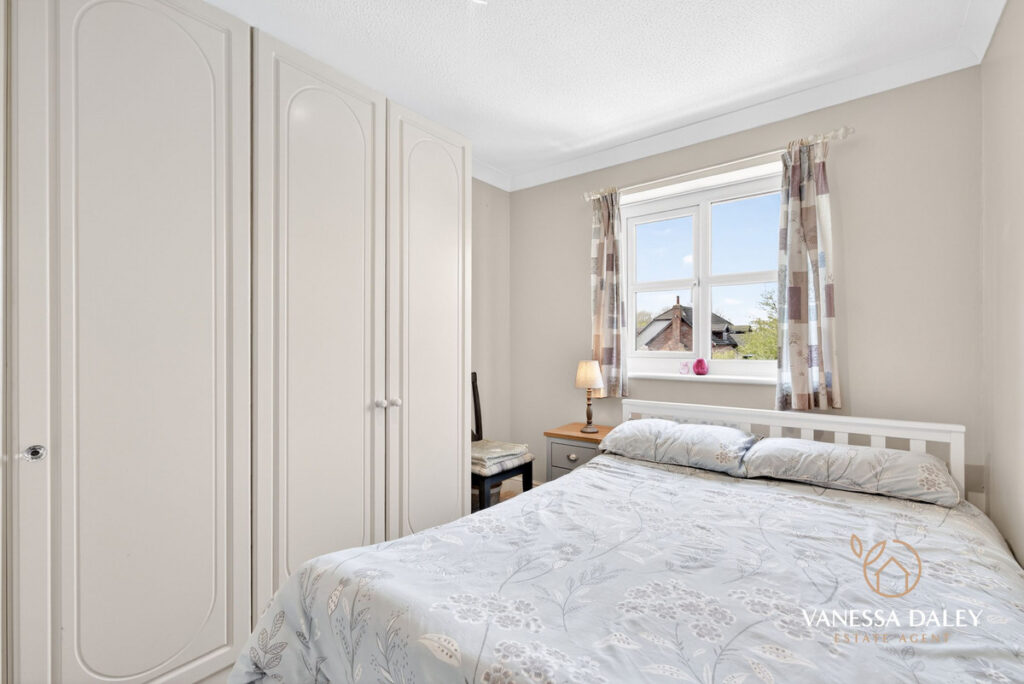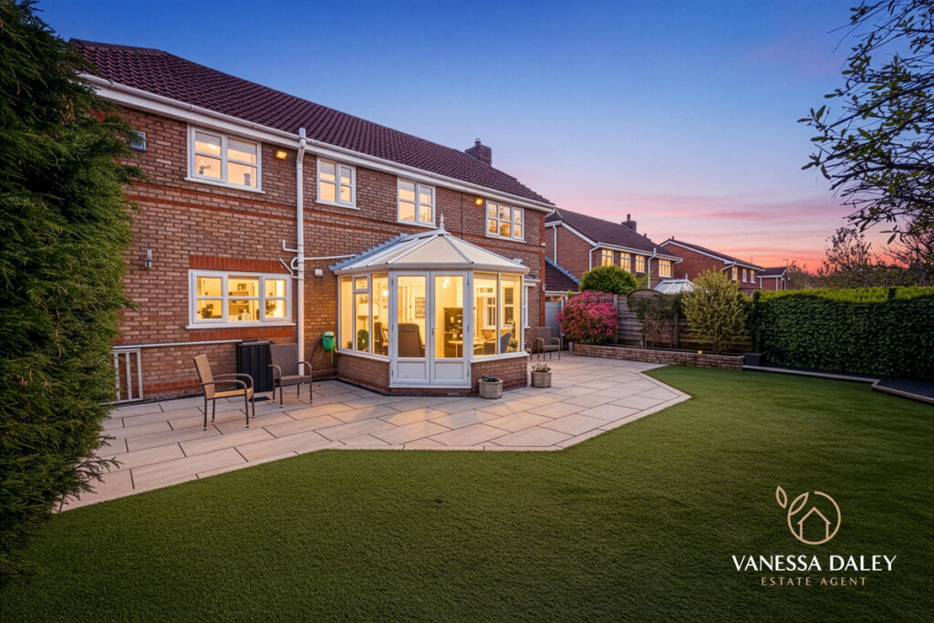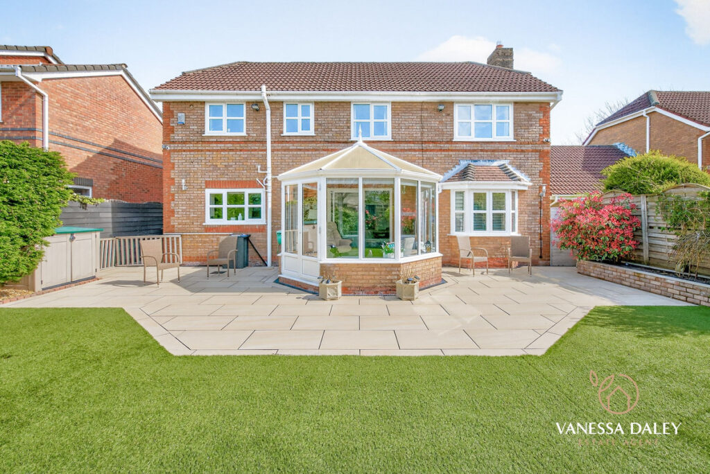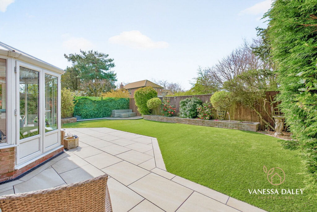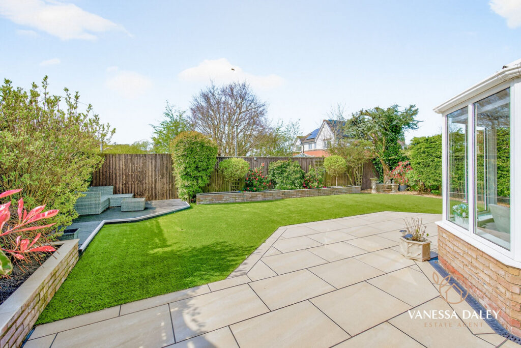 The fully landscaped rear garden is west‑facing, capturing sunlight throughout the day. Designed as a peaceful, low‑maintenance retreat, it features a porcelain‑tiled patio extending the full width of the house, an artificial lawn, and raised walled borders planted with mature trees and shrubs that provide year‑round greenery and complete privacy.