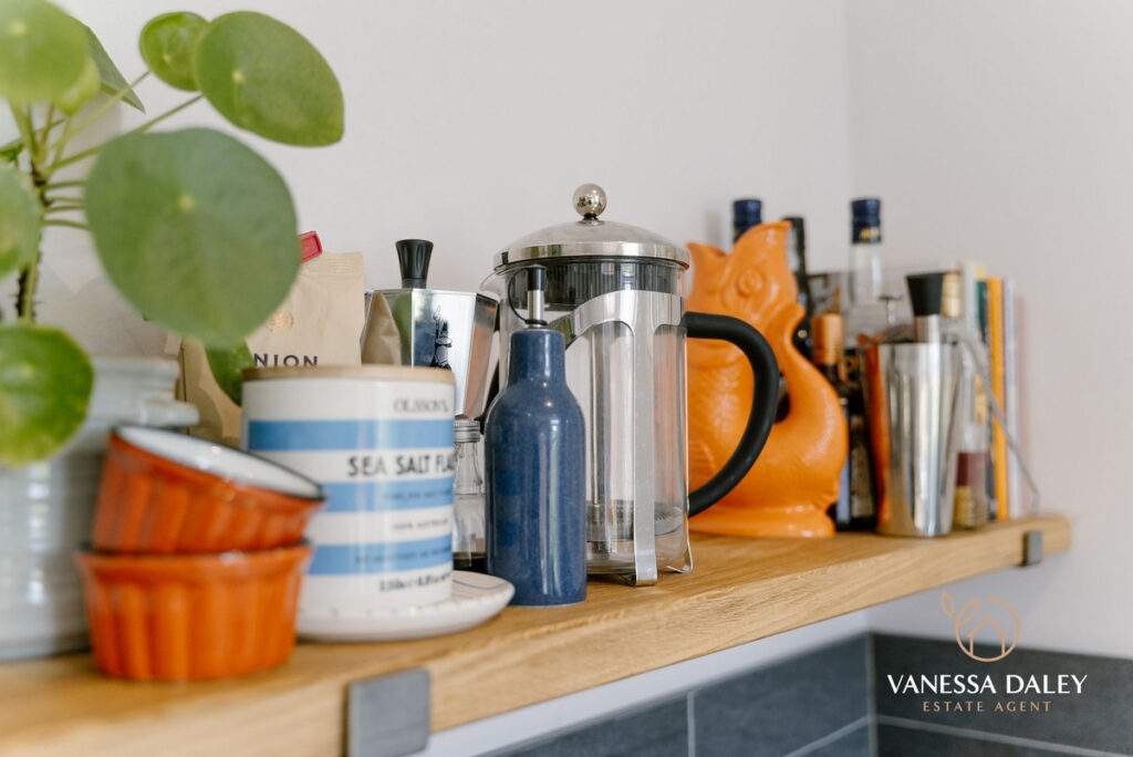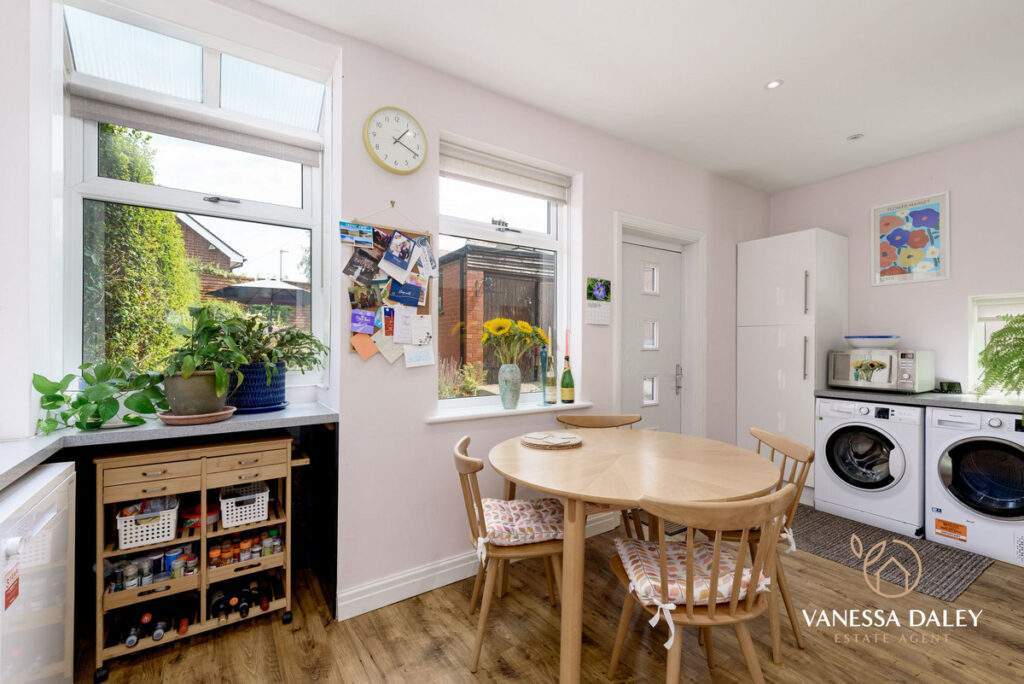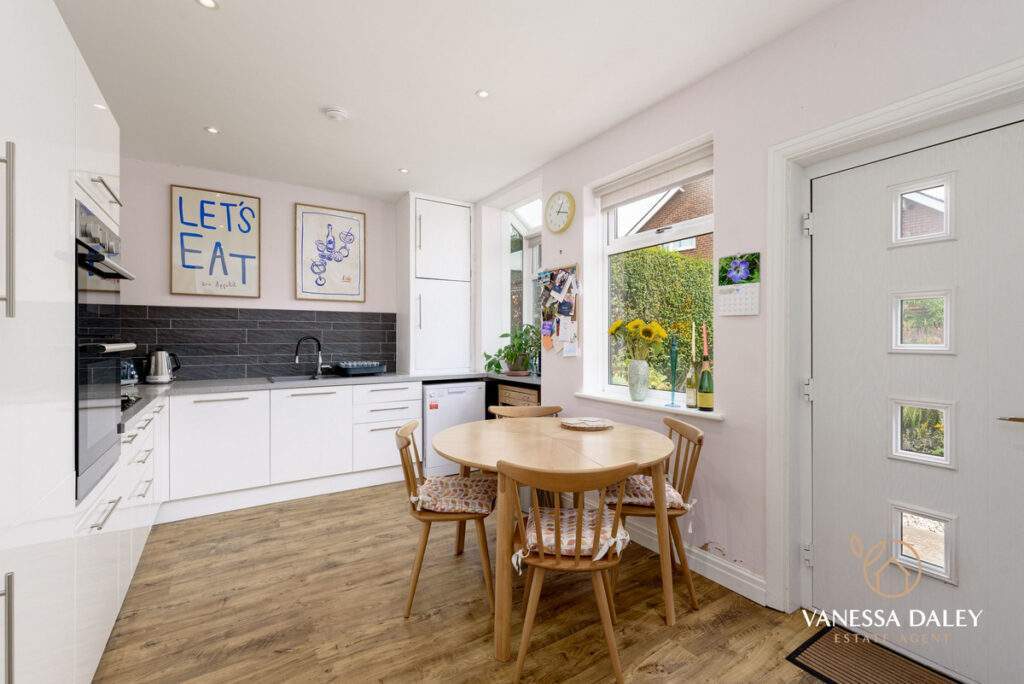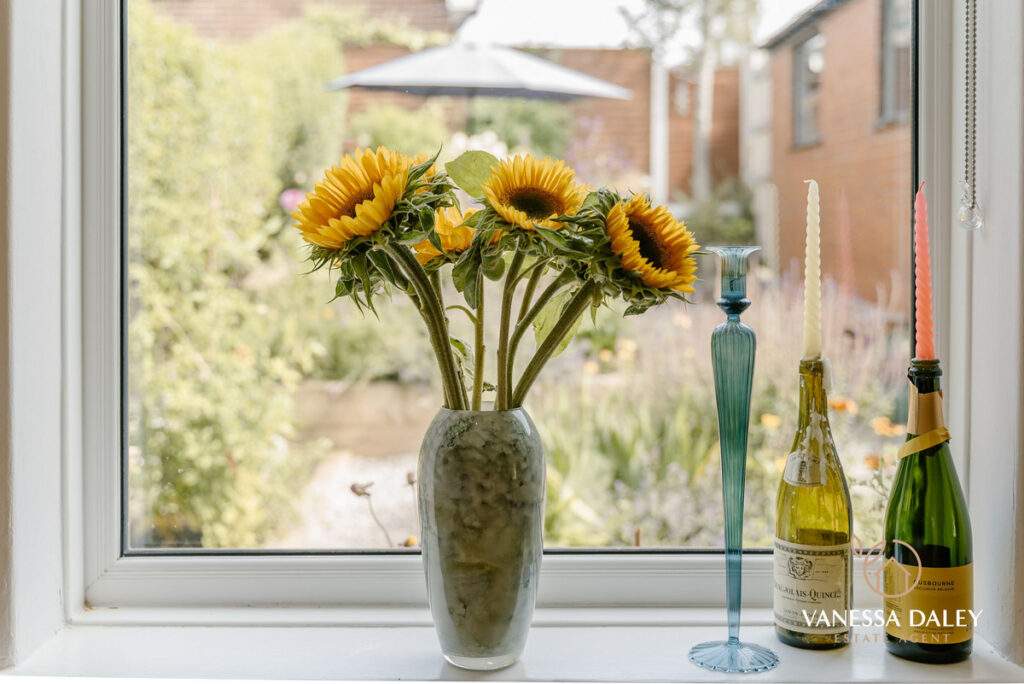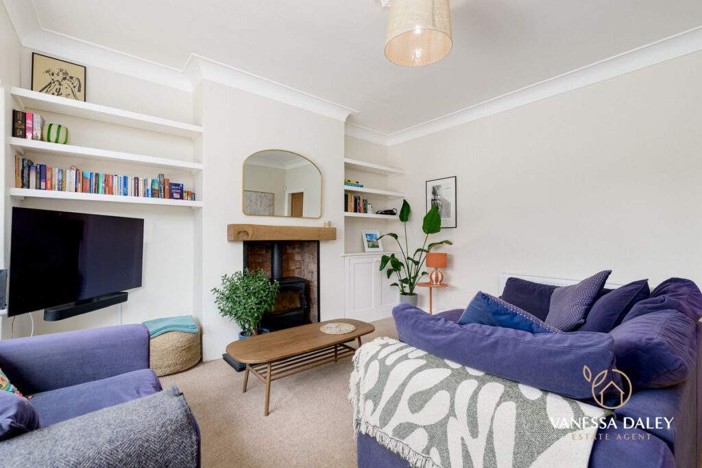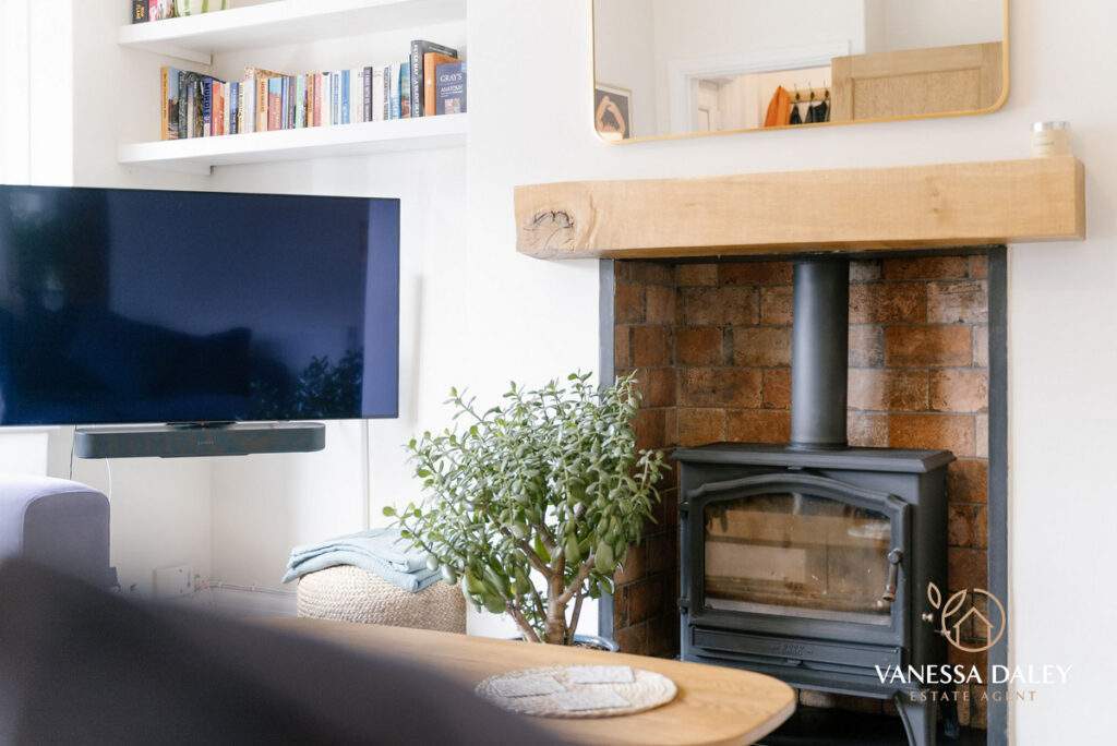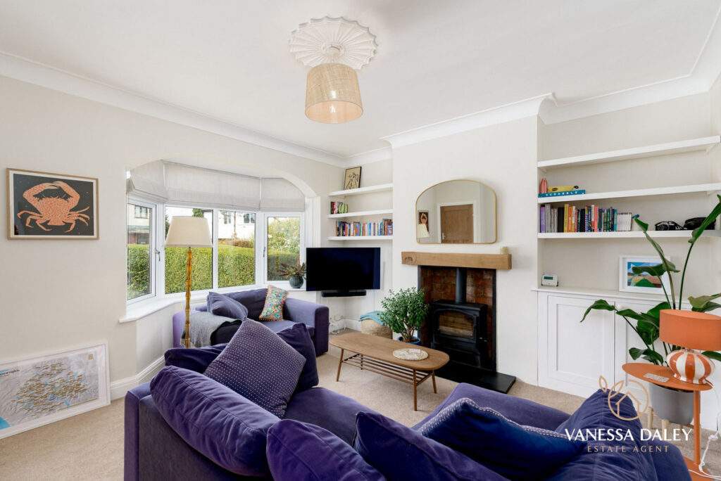 The entrance vestibule is compact with original tiled flooring and the space is therefore larger in the main reception room without the through hallway. With a cosy ambience this room has space and an attractive bay window overlooking the front hedge enclosed driveway, yet as this property sits in a cul-de-sac the outlook feels secluded. There is a wood burning stove for supplementary heating during the chilly winter months.