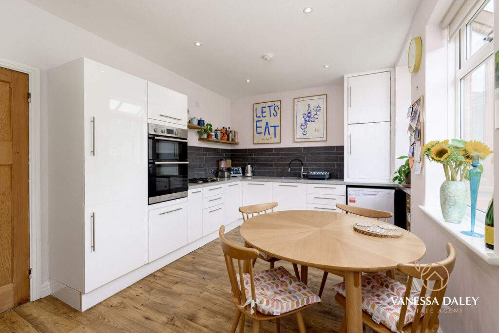 Both of the ground floor living areas are flooded with light and of great proportions. Conveniently, the kitchen is open plan with dining space and has a utility area to one side and access to a ground floor WC. Presented in modern timeless design the white wall and base units enhance the space and built in appliances include gas hob, double oven, fridge freezer and space for dishwasher, washing machine and dryer.
