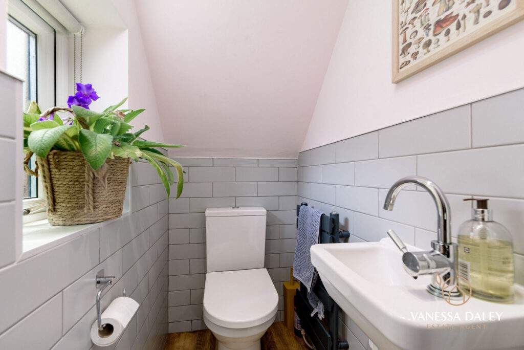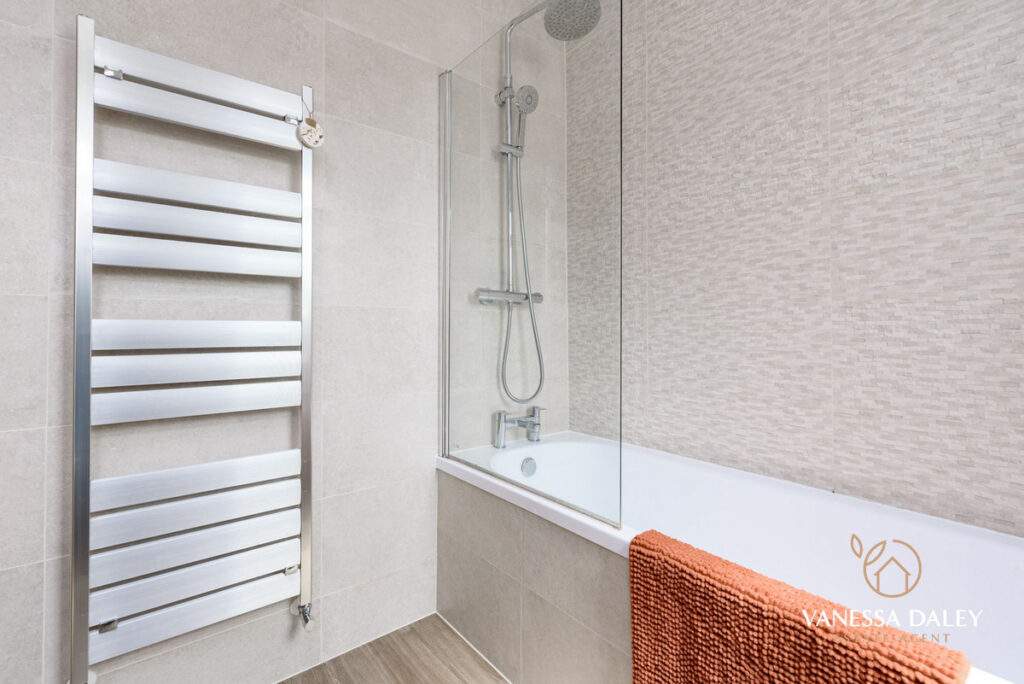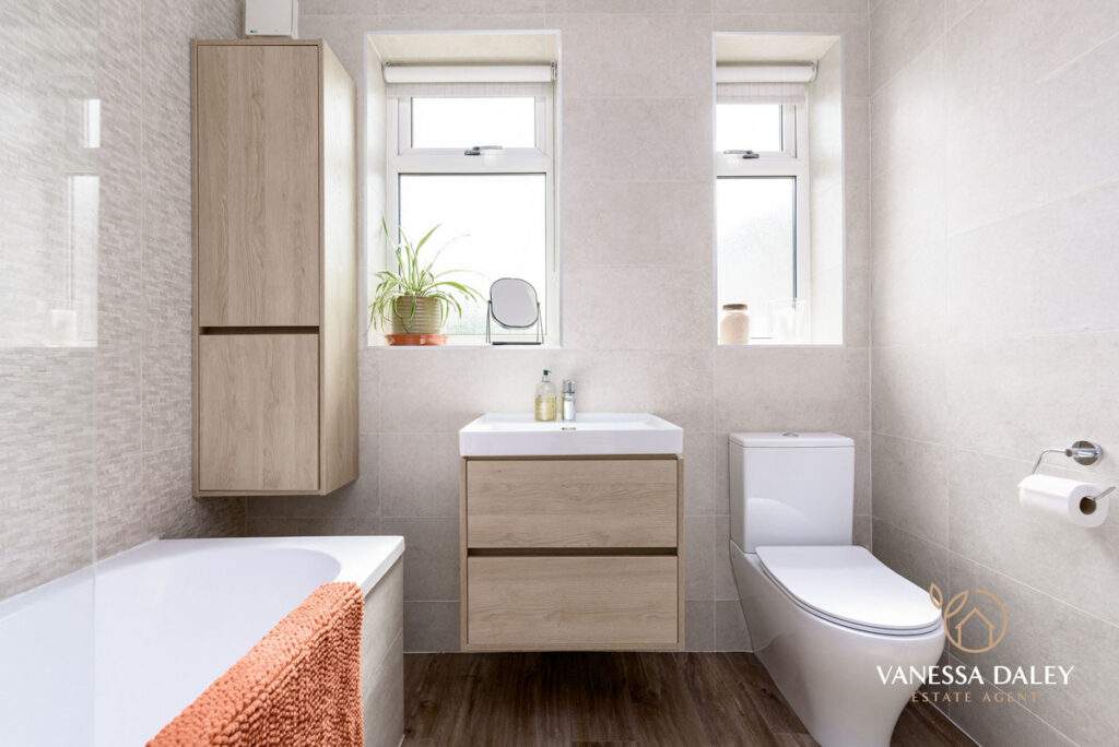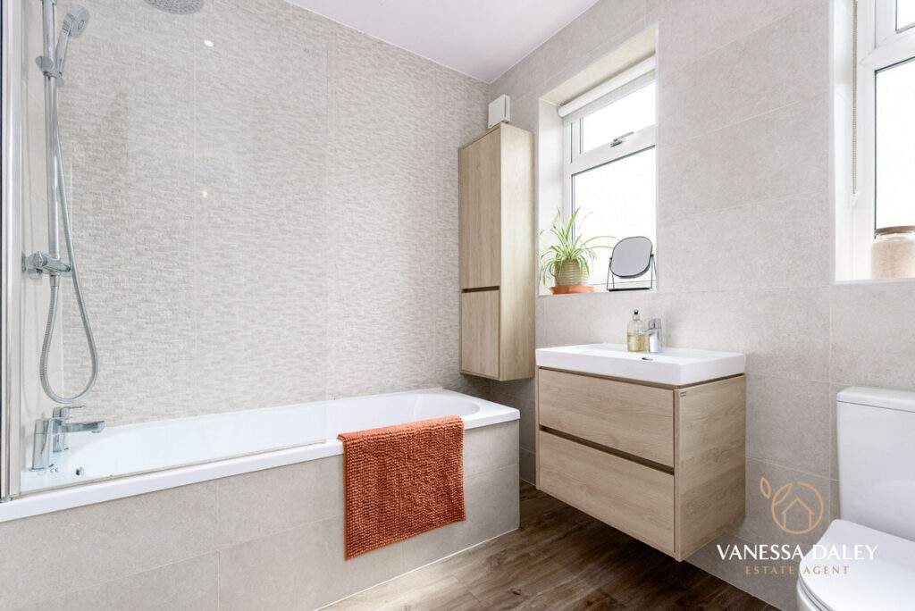 The bathroom has also been modernised to a high standard and has two windows to bring in the daylight. Storage is great as the sink has vanity drawers underneath and there is a tall wall unit to conceal belongings away. There is a shower over bath and WC and the flooring contrasts to the walls.
