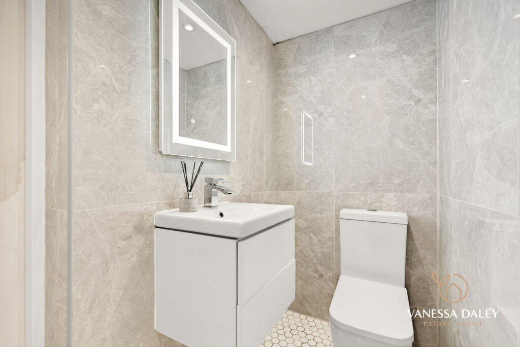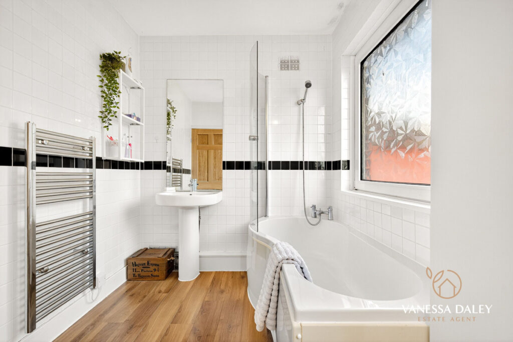 The family bathroom is spacious as the wall has been taken out between the separate WC and the bathroom making the space open plan. There is a 3 piece fitted white suite and tiled white wall elevations.