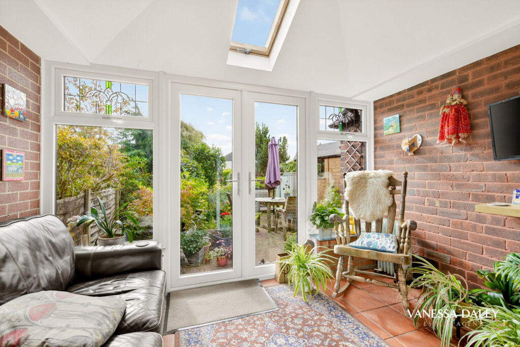 Internally, all of the rooms are pleasantly spacious with the main living room overlooking the lovely front garden with cosy living flame gas fire. A further reception lends itself as a dining room or second sitting room and a lovely bonus is the additional garden room with French doors to the garden. A room with a solid roof and flooring makes it ideal for use year around.