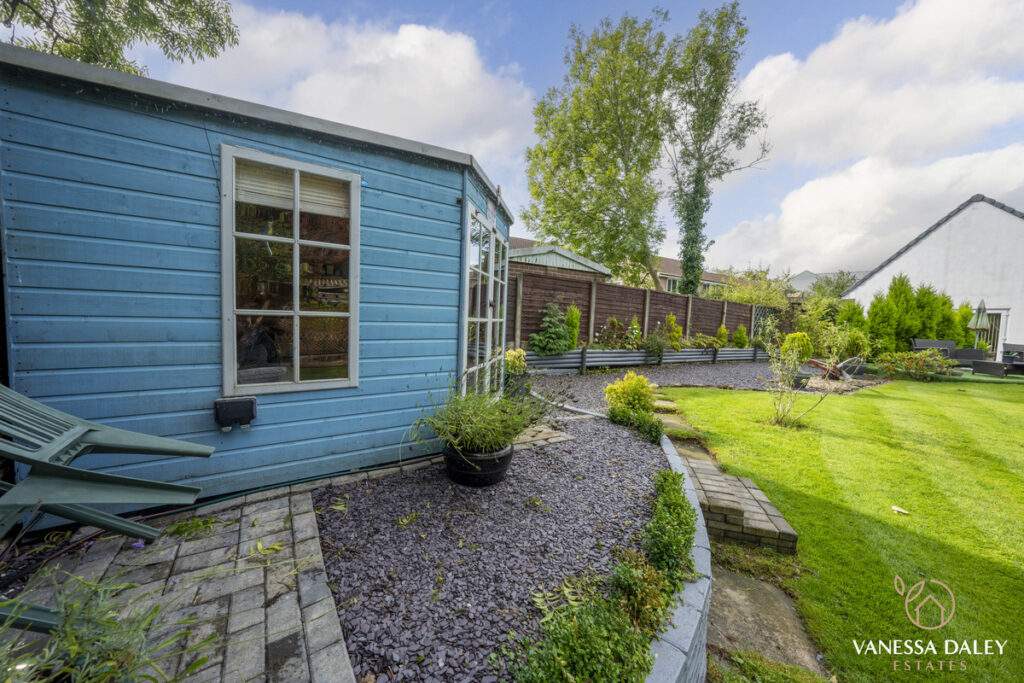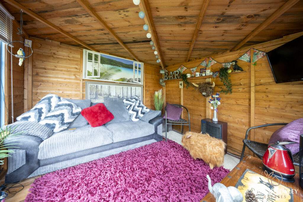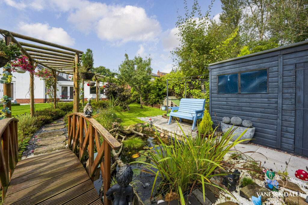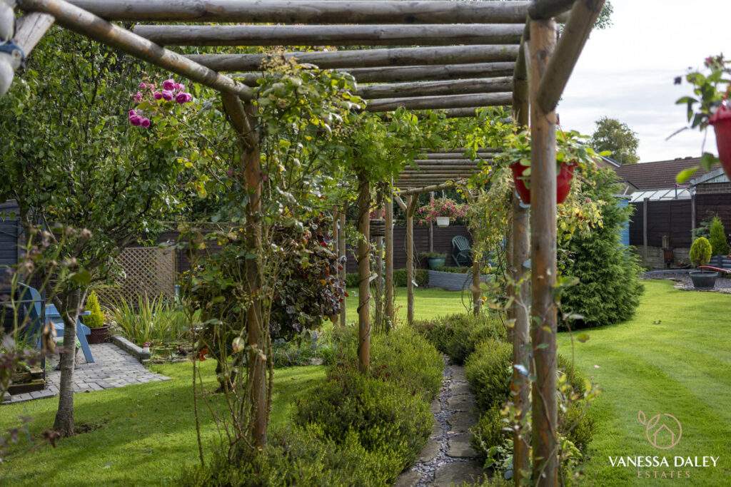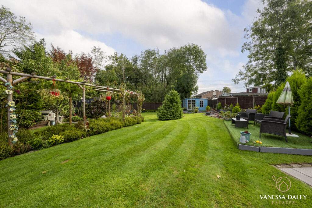 The integral double garage with a workshop is ideal for those needing extra storage or workspace. The front and rear gardens are landscaped attractively and to the bottom of the garden, there are mature trees beyond which enhances the feeling of nature and privacy. The garden is interesting with multiple places to sit and enjoy different vistas, and there’s a charming walkthrough pergola with wooden bridge. The outdoor garden room is a perfect space to work from home or relax in beautiful surroundings. For nature lovers, the garden has a vegetable patch and a variety of fruit trees and shrubs to include pear tree, hazelnut tree, loganberries, blackcurrants and strawberries.