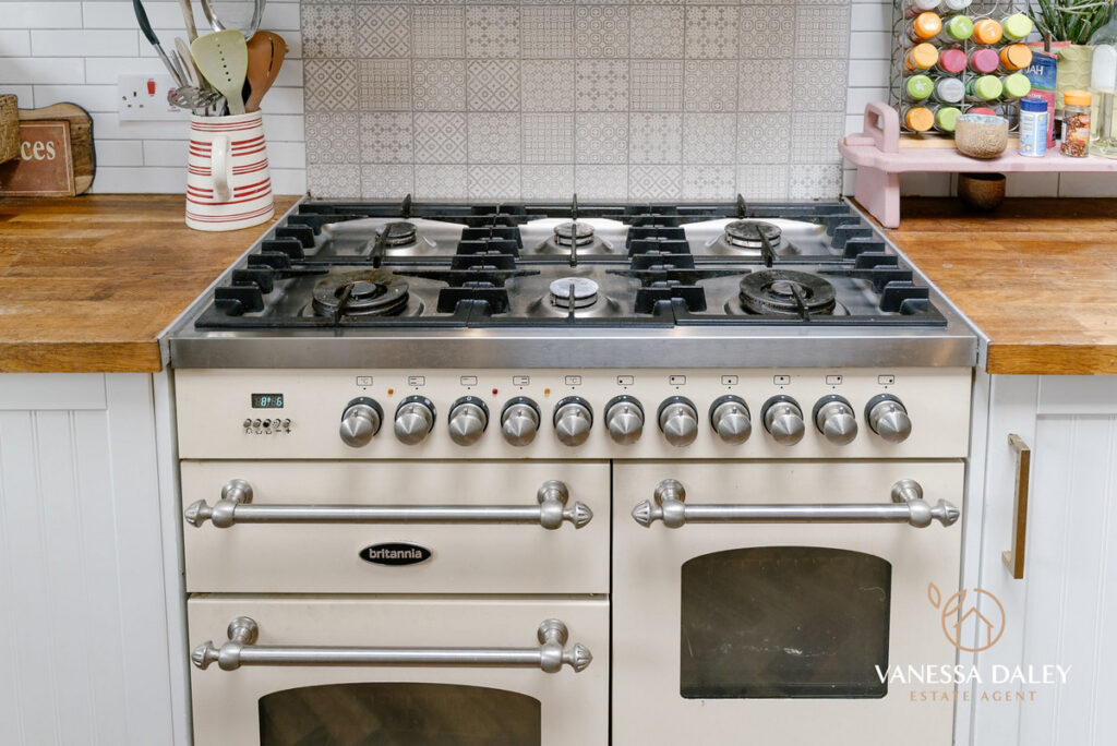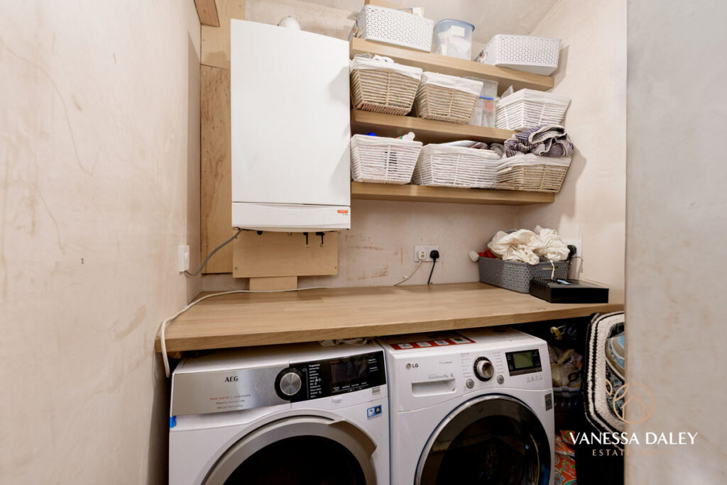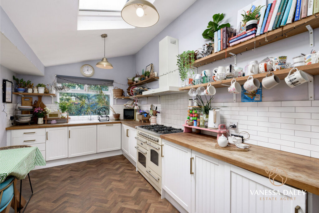 Every inch of space has been carefully thought out to maximise the space, and there is a convenient utility space, ground floor WC and also a walk in pantry cupboard. Whilst the kitchen dining room is open plan, the kitchen is zoned off to one side with ample space for a dining table to the other. White shaker style base units with wooden butchers block worktops wrap around in a L-shape with excellent storage space, and appliances to include; a gas Range cooker, ceramic sink and integrated dishwasher, Ample space for a fridge freezer. The space feels bright and airy thanks to the high ceilings and Bi fold doors opening to the garden. Additionally, the Karn Dean herringbone flooring opens up the space further.