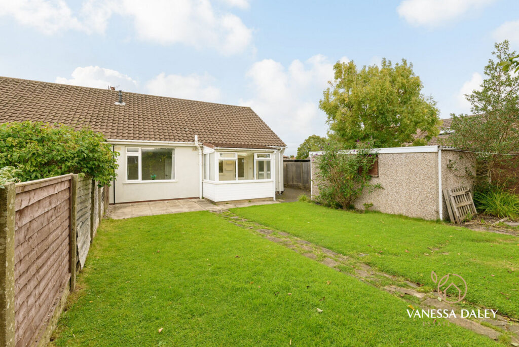In a quiet location, this bungalow is tucked back and secluded with a walled front lawned garden and private driveway and south facing lawned garden.