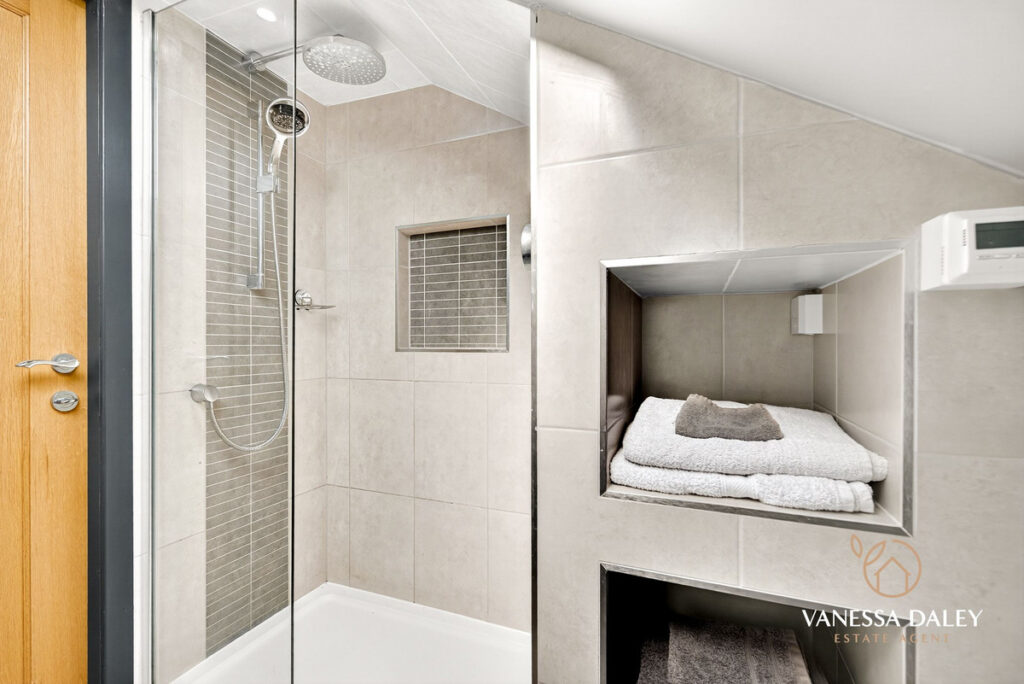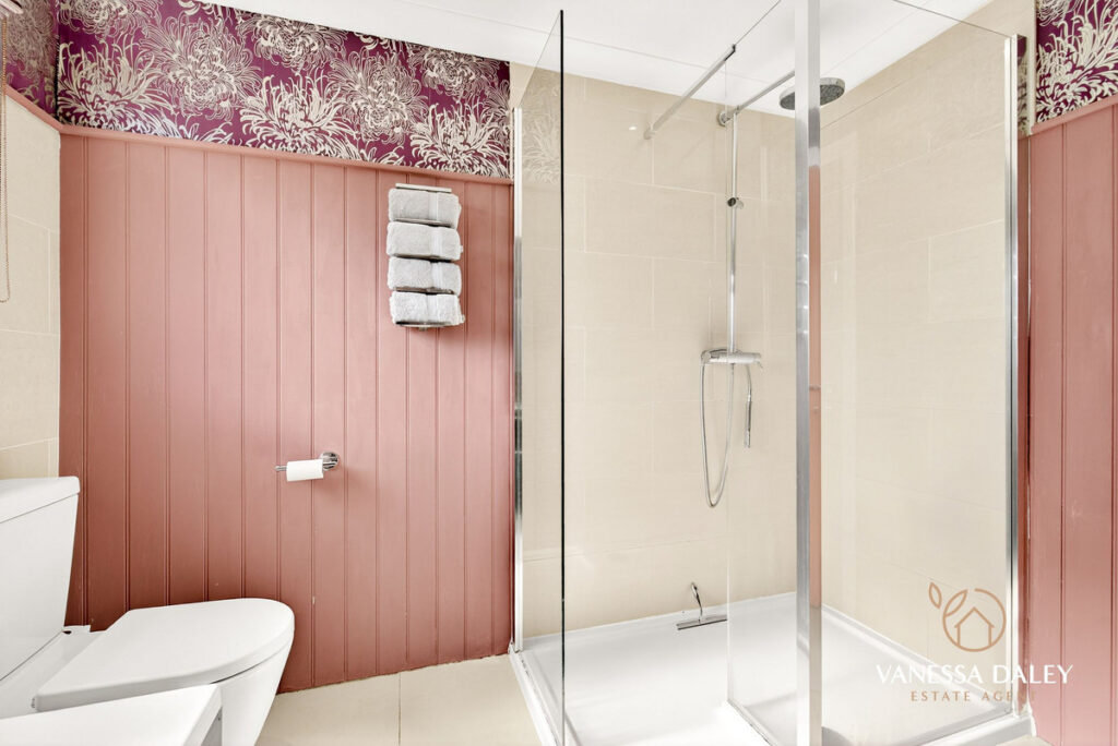 Uniquely, all of the bedrooms are double rooms, 4 in total, yet one of the bedrooms has a study area which could be made into a 5th bedroom if the need arose. The main bedroom is well appointed and spacious with a dressing room and en-suite shower room.