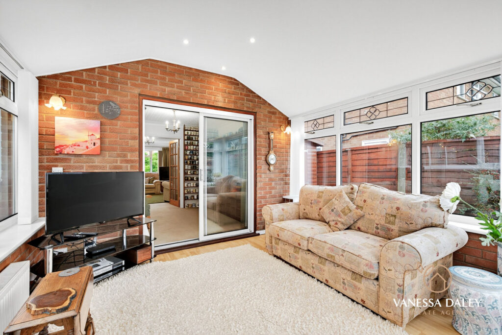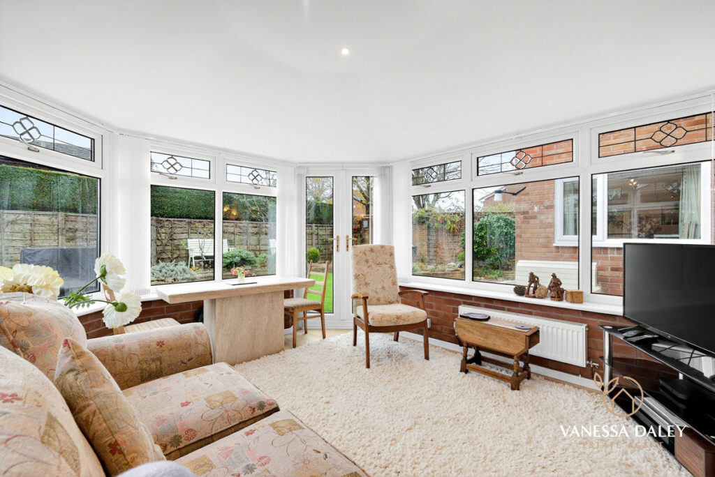 The ground floor layout is both spacious and versatile. Rooms are generously sized, providing plenty of flexibility for modern living, and several are connected via double doors, allowing the option of a more open-plan flow. The first of four reception rooms enjoys views over the front lawn and features a brand-new living flame gas fire. From here, double glass doors lead to an additional reception space and then into a garden room, recently upgraded with a pitched roof and central heating—making it a welcoming retreat throughout the year.