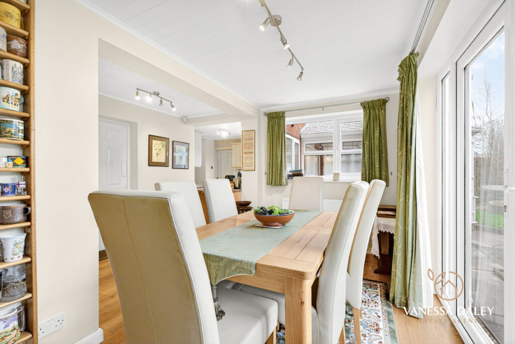 The well-appointed family kitchen includes an extensive range of fitted units and integrated appliances, including an induction hob, fridge-freezer, dishwasher and an additional second fridge. The adjoining dining area is bright and airy, offering open access to the kitchen, French doors to the garden, and entry to both the utility room and the integral double garage.