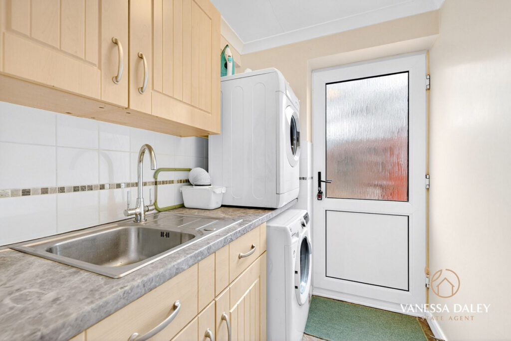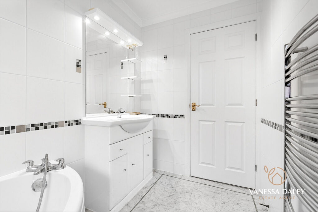 Luxurious Karndean flooring flows through the hallway, kitchen, dining room and bathrooms, enhancing the home’s overall presentation. The hallway gives access to a convenient ground floor WC, the main living room and the kitchen, with attractive turning stairs rising to a spacious landing.