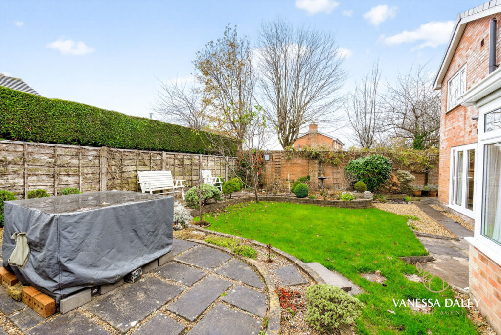 The rear garden is a particular highlight: south-facing, deceptively spacious, and designed for easy maintenance. A raised, curved flagged area provides two attractive patio spaces with a central lawn. Additional areas to each side of the property include a paved courtyard with gated access to the front, and a larger section with a storage shed and covered storage area. Enclosed by walls and fencing, the garden offers both security and seclusion. A delightful array of fruit trees—including apple and plum—complements the outdoor space, along with redcurrant, blackcurrant and rhubarb plants.
