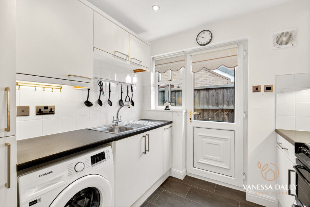 The kitchen has been modernised with high gloss white wall and base units and contrasting flooring. Space for electric oven and plumbing in place for a washing machine. Ample worktop space and a door opening to the side elevation.