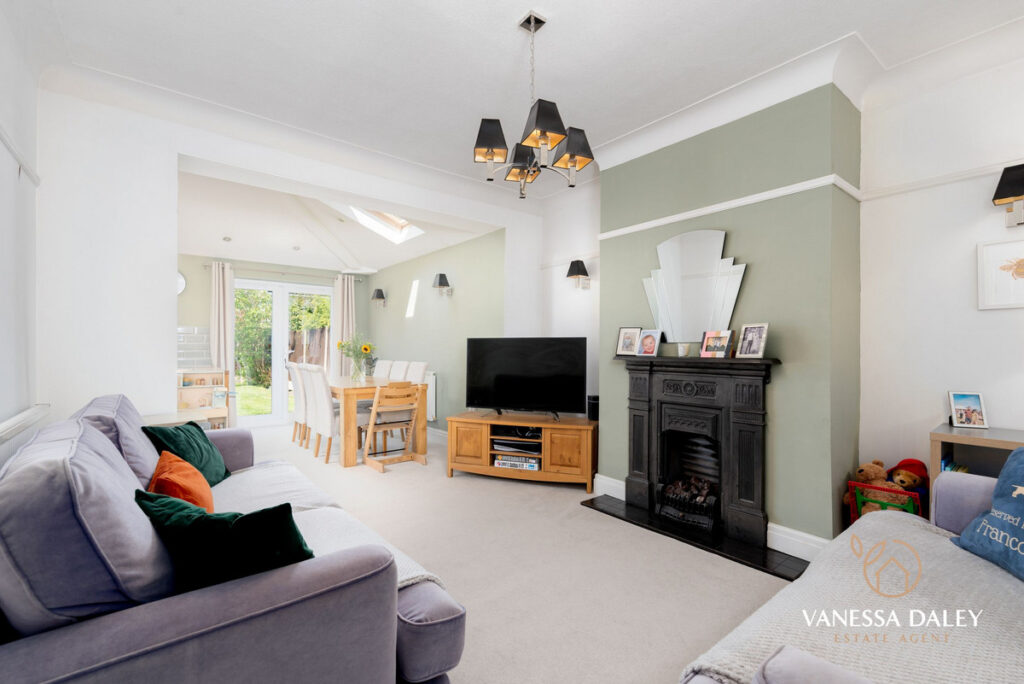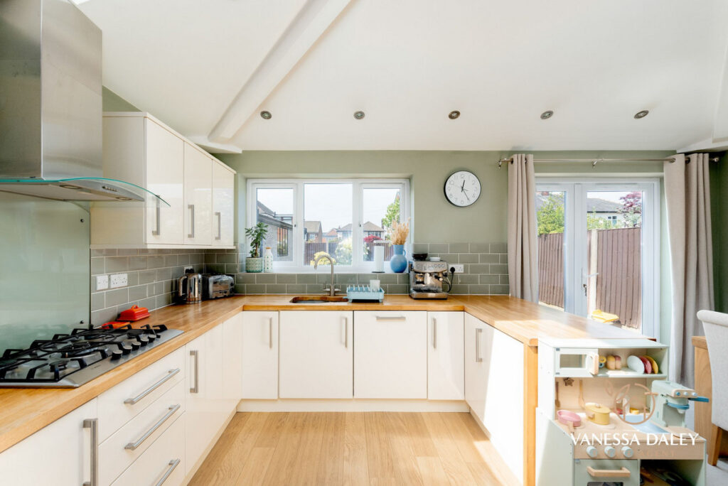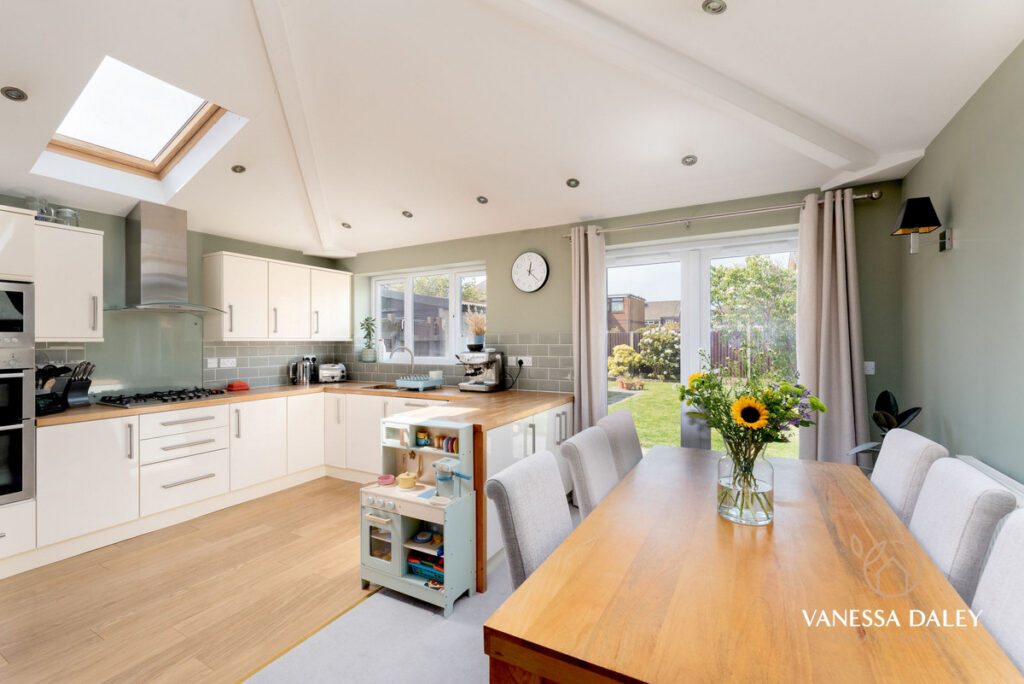 Having been extended the property now benefits from a sizeable kitchen area with vaulted ceiling and French doors opening to the lovely rear garden. Ample cupboard and storage space for the modern family in the kitchen area which is laid out in a timeless design of cream wall and base units with Bosch integrated appliances, under counter fridge, double oven and 5 ring gas hob, and oak effect flooring to the kitchen side and carpeted to the dining side. Such a lovely space, yet conveniently open to the second reception room too so makes this space ideal for entertaining. The outlooks to the garden are pleasant and this room is flooded with daylight from the windows and doors and Velux windows.