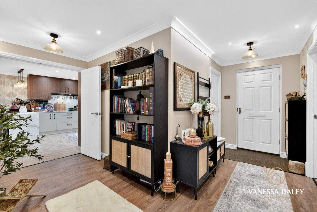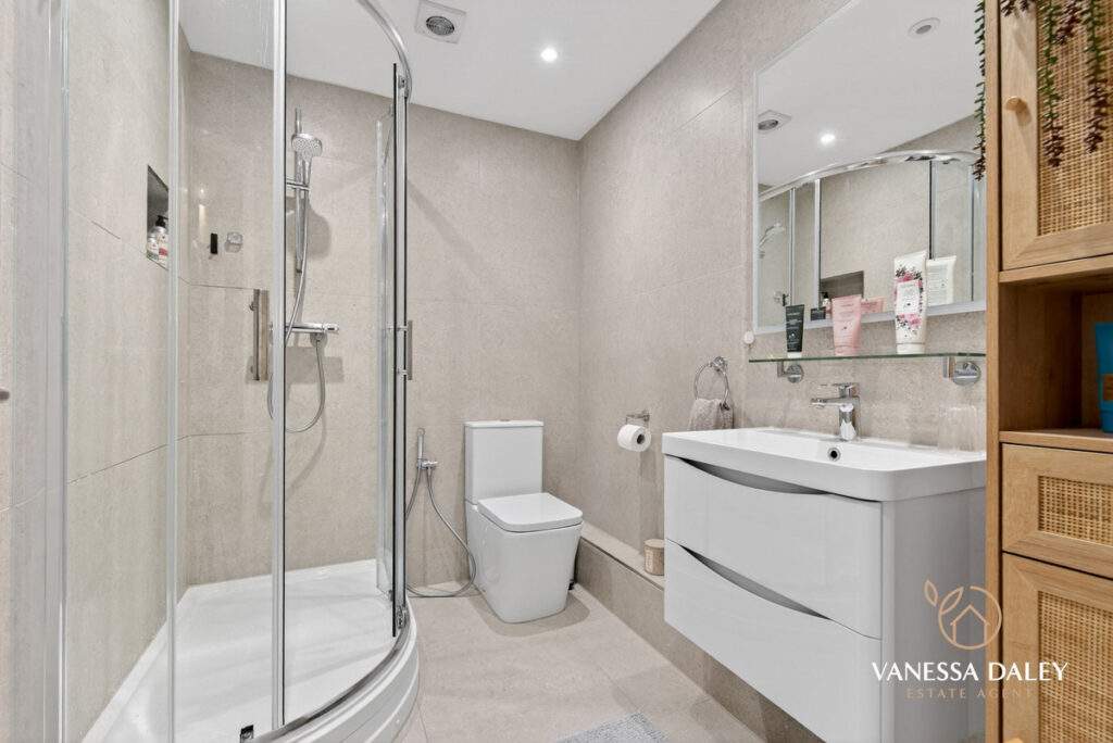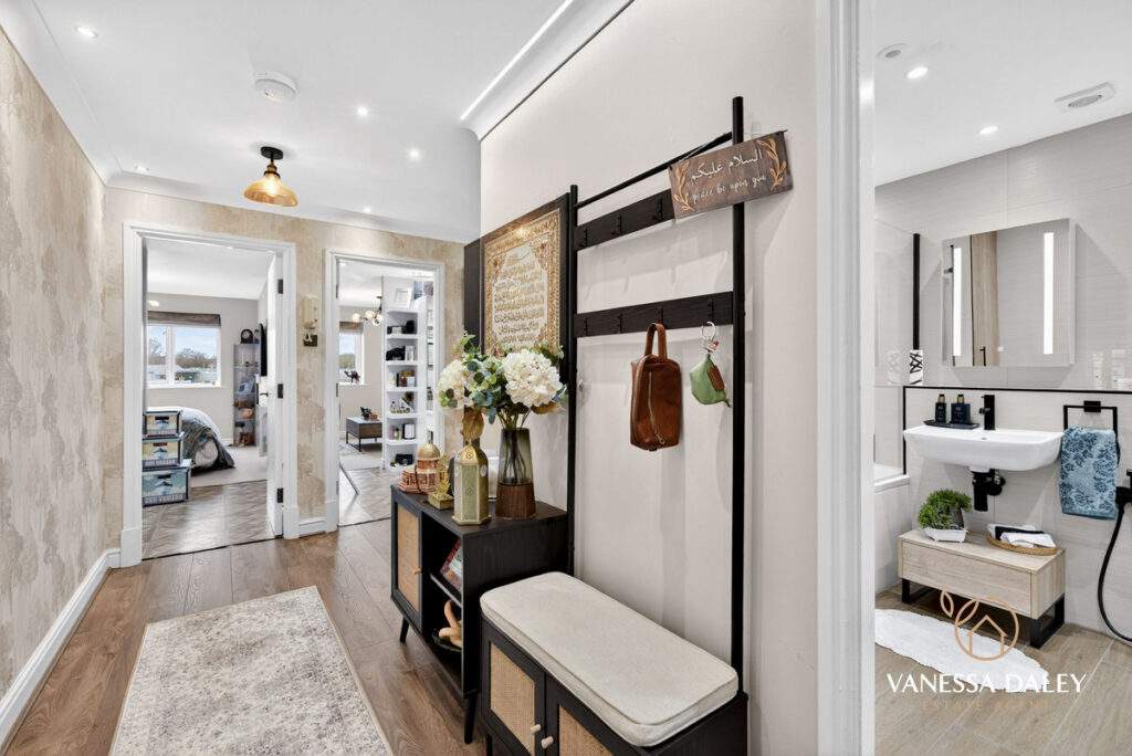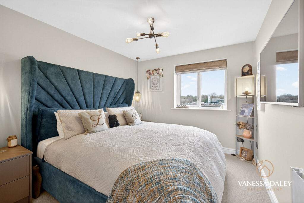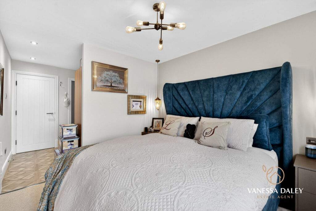 The home is a testament to the current owners, who have styled every inch in elegant neutral tones with high‑quality flooring and carpets. The principal bedroom comfortably accommodates a super‑king bed and features a cleverly partitioned dressing area with generous wardrobe space and access to the en‑suite. Basket‑weave flooring adds a refined touch, while the en‑suite itself is fully tiled in soft neutrals and fitted with a three‑piece suite including a double shower, WC, and vanity‑unit sink.