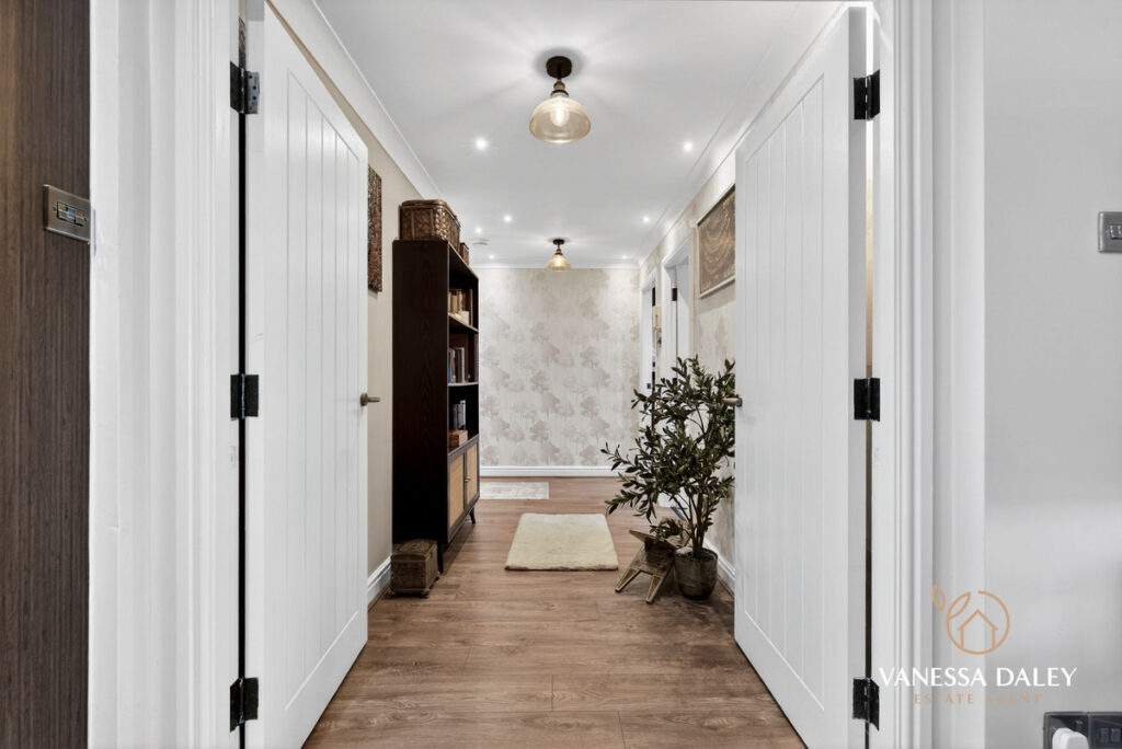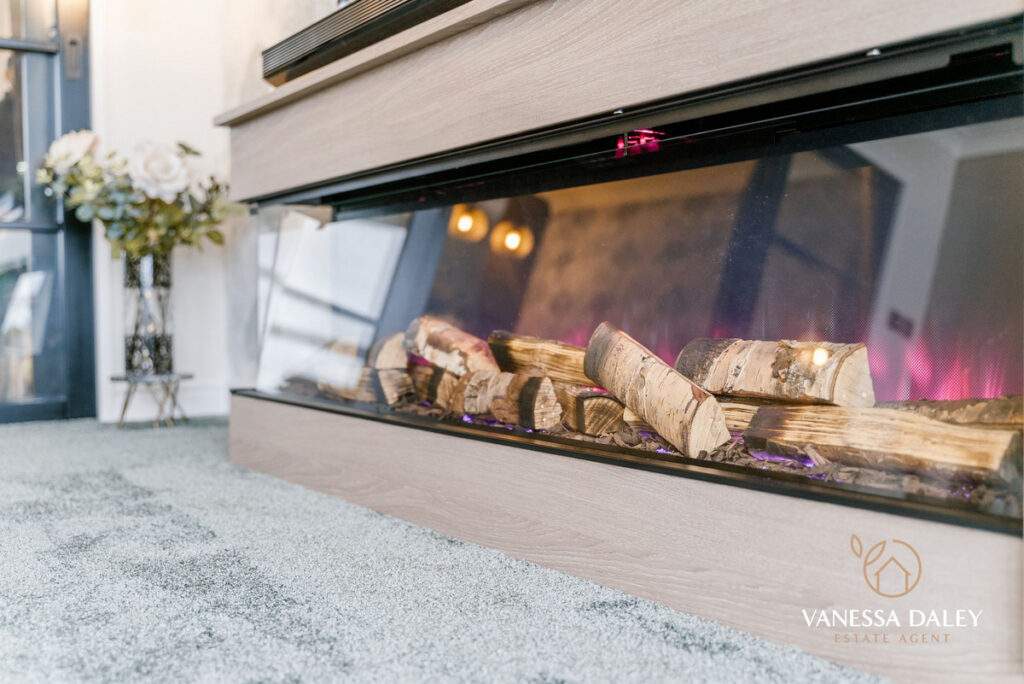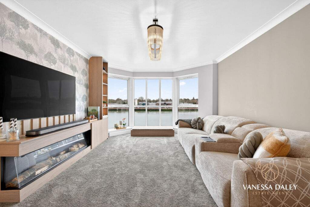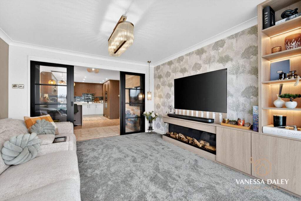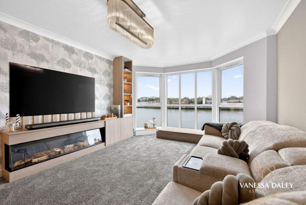The L‑shaped hallway leads to the living areas, where double doors create a graceful transition. The layout feels open‑plan yet can be subtly divided thanks to sliding Crittall‑style doors, allowing the space to shift effortlessly between airy openness and cosy intimacy. Floor‑to‑ceiling bay windows flood the room with natural light and offer captivating sunset views. A bespoke media wall with integrated storage and an electric log‑effect fire forms an attractive focal point.