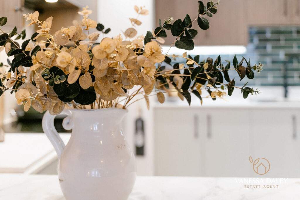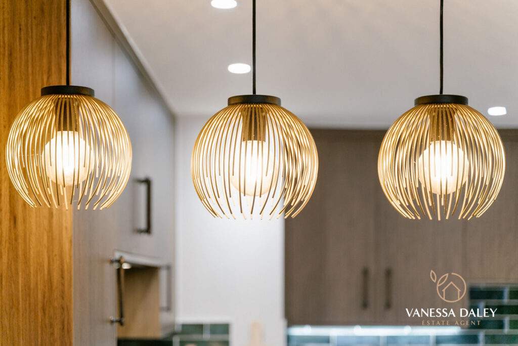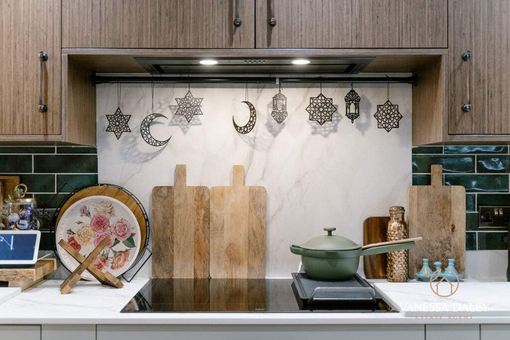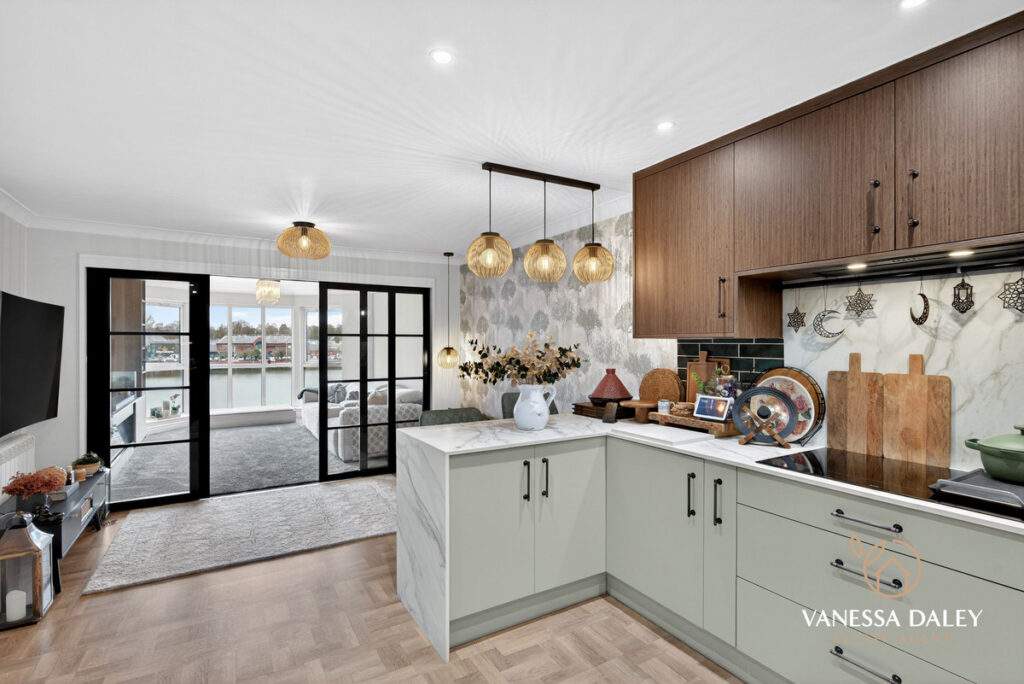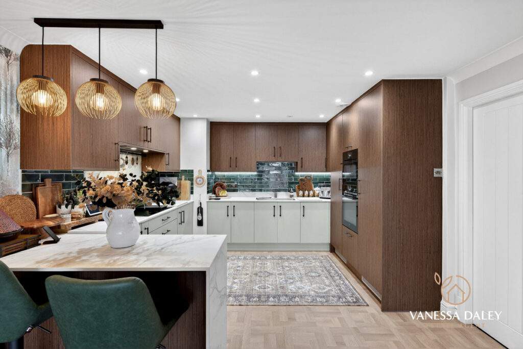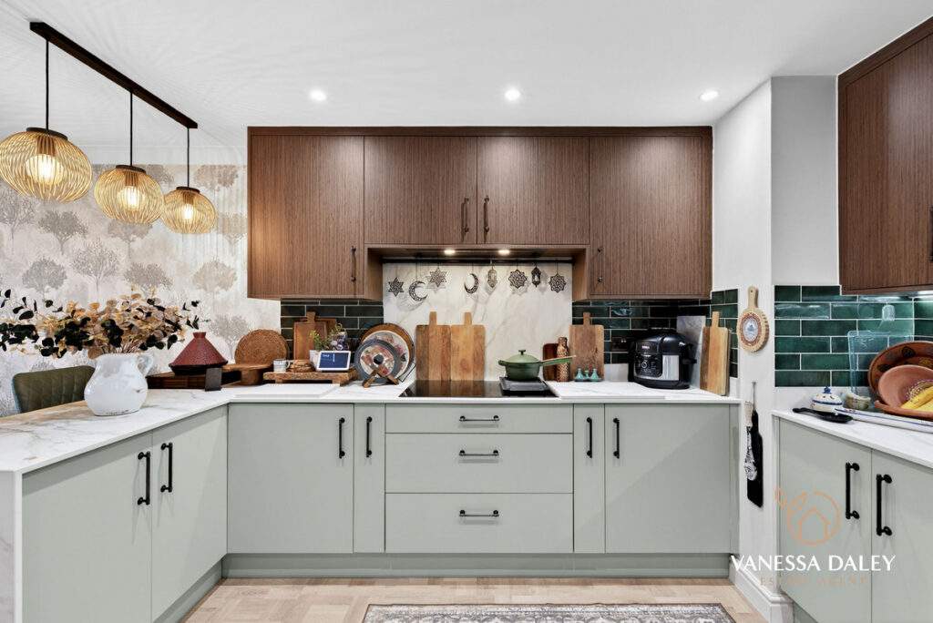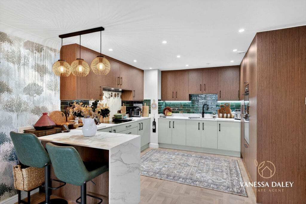 The kitchen and dining area extend an impressive 6 metres, offering remarkable space for an apartment. A breakfast bar with seating subtly defines the two zones. Elegant walnut wall units pair beautifully with sage‑green base cabinets, providing excellent storage. High‑quality AEG appliances include a full‑height fridge and freezer, microwave oven, steamer oven, and induction hob. The washing machine is neatly housed in a utility cupboard off the hallway. Green brick‑style splashback tiles and pendant lighting over the breakfast bar add a chic finishing touch.