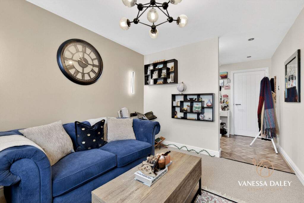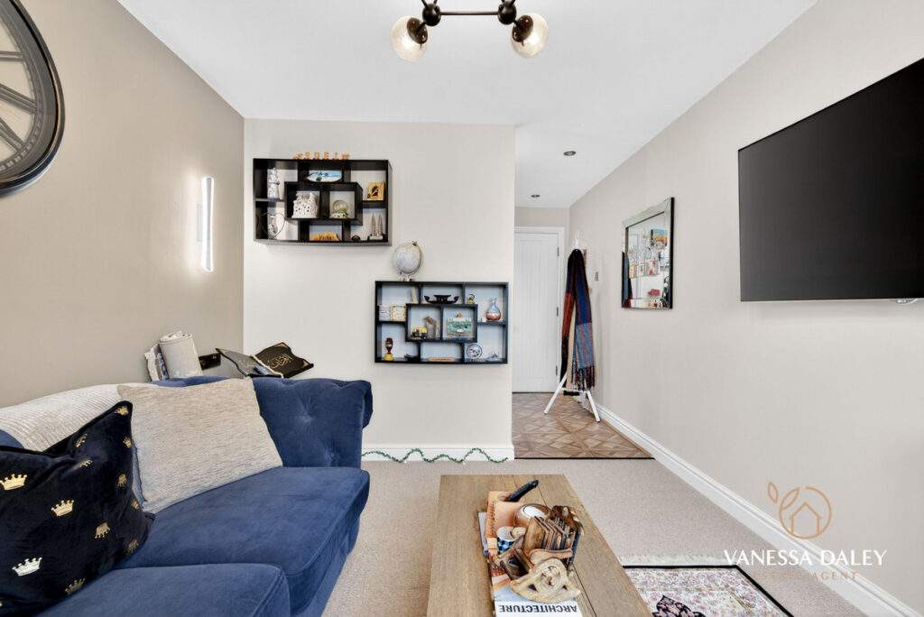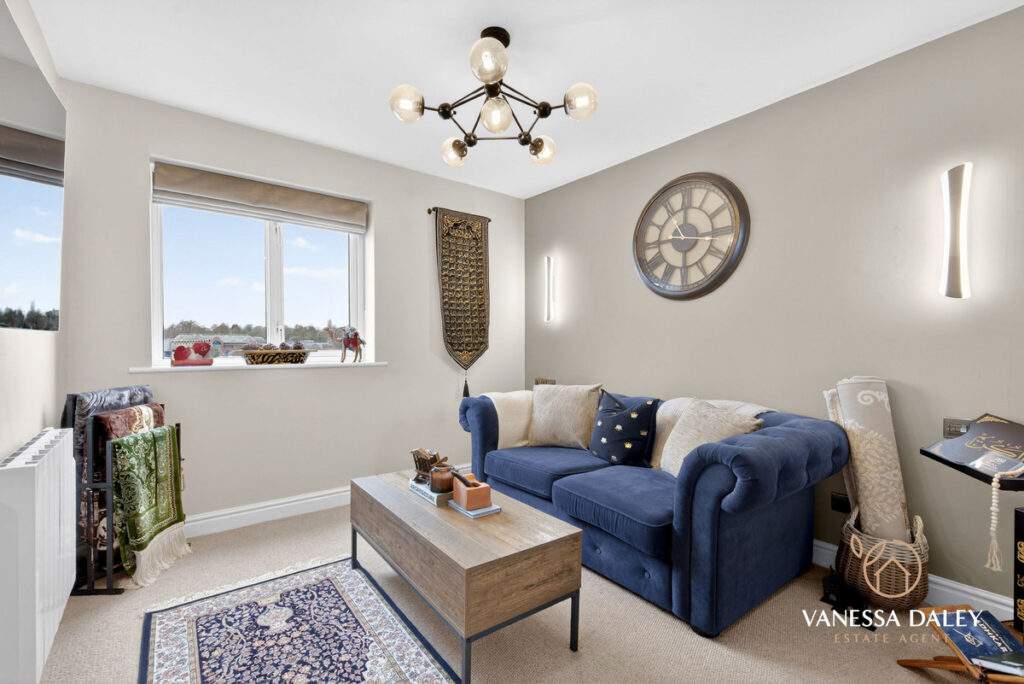 Bedroom two is currently arranged as an additional living space, complete with a partitioned dressing area—ideal as a third reception room or a versatile guest bedroom.