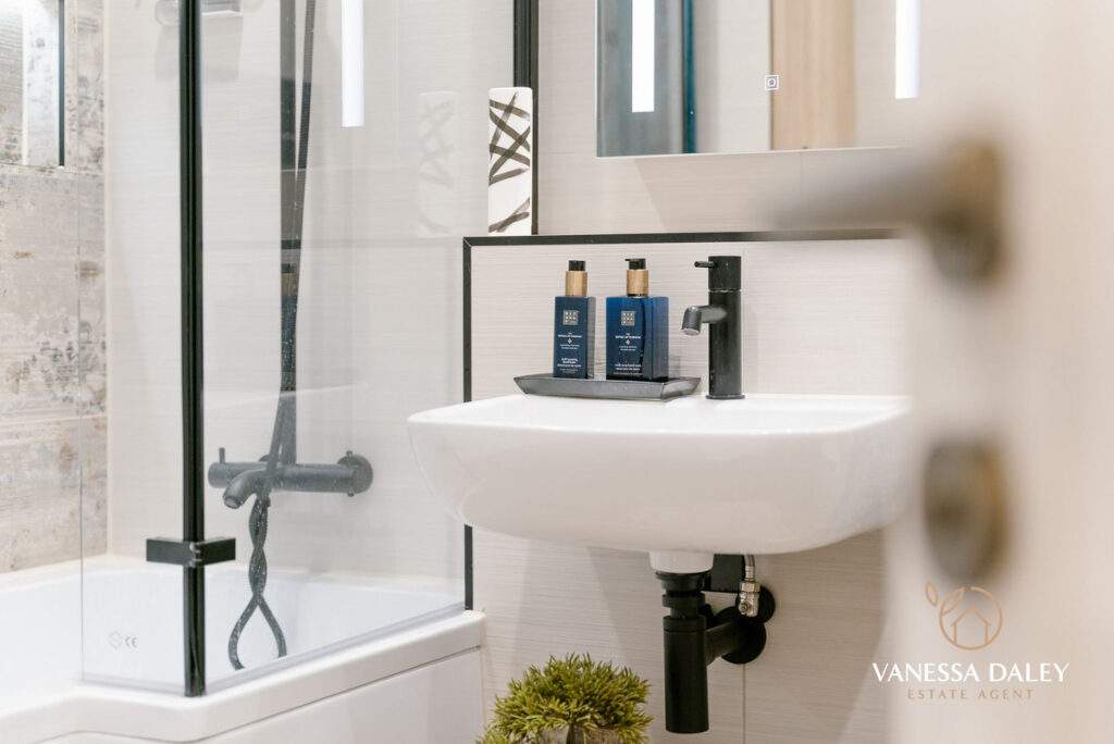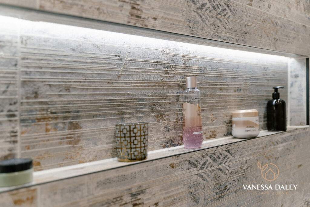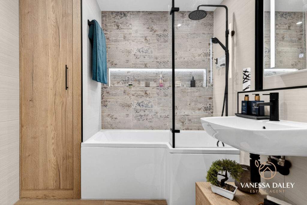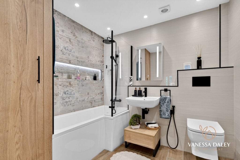 The main bathroom is beautifully appointed, featuring a striking tiled feature wall around the bath, a recessed shelf for toiletries, and a rainfall shower above. A floating sink and additional WC enhance the sense of space, complemented by a built‑in storage cupboard.