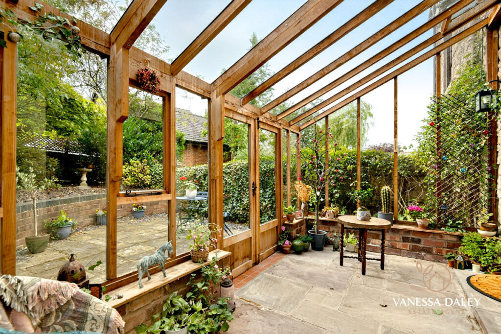 The conservatory is a peaceful additional space yet is more of a summer room as the glazing is single glazed with door to the area. Stone flagged floor. Double doors open to a courtyard style garden with patio area and fence enclosure the outdoor space is designed to be low maintenance. A gate gives access to the back and from there to the Millennium Green orchard is a short distance away. The property boasts a detached double garage a few steps away with driveway for two cars.