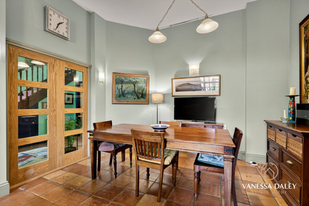 The covered storm porch give the ideal space for leaving your walking boots after your country walk and from here you will step into an imposing hallway with stained glass panels, high ceilings and winding staircase to the first and second floors. The terracotta flooring adds to the character feeling and there are double doors to the dining kitchen and a door to the living room.