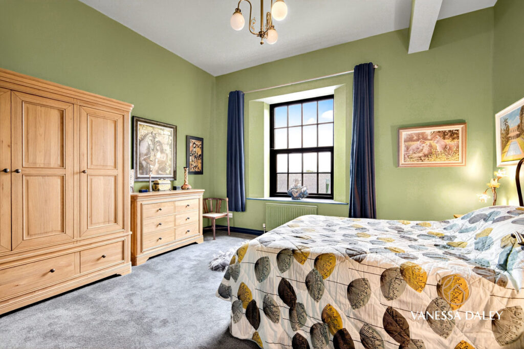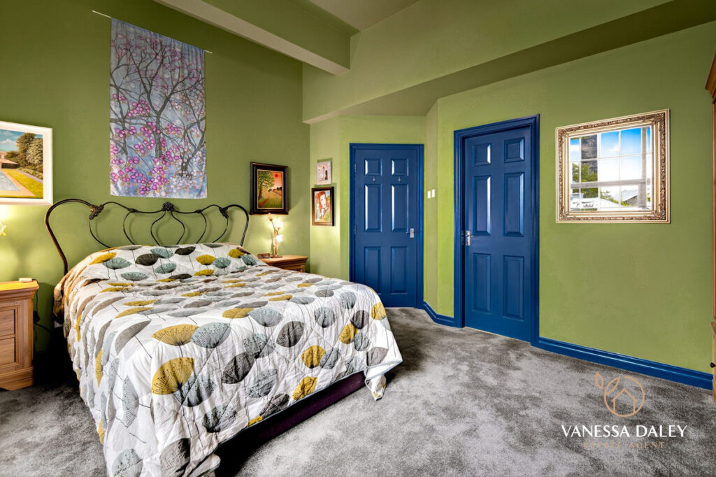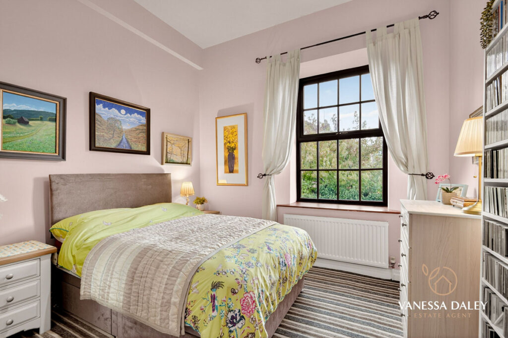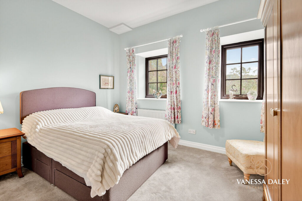 To the first floor the landing area is spacious and there are four bedrooms, three of which are good sized double rooms all with lovely outlooks. The master bedroom boasts an en-suite wet room, fully tiled in neutral colour scheme with soaker shower, WC, pedestal wash hand basin and illuminated mirror over. The master bedroom has a view to the Mill.