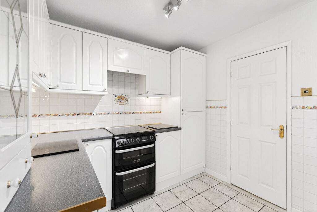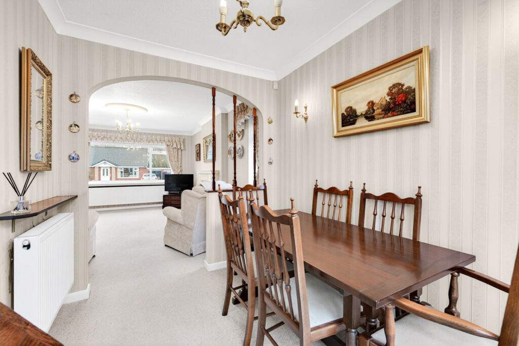 Completely neutral decor throughout makes this home turn key with only optional cosmetic improvements if desired. With generous living room overlooking the pleasant front lawned gardens this is a cosy yet spacious room with a large window allowing in lots of light and an attractive fireplace housing a gas fire. The dining room is open plan from the living room so the layout blends seamlessly yet still feels like a separate space and from here one can access the garden through patio doors.