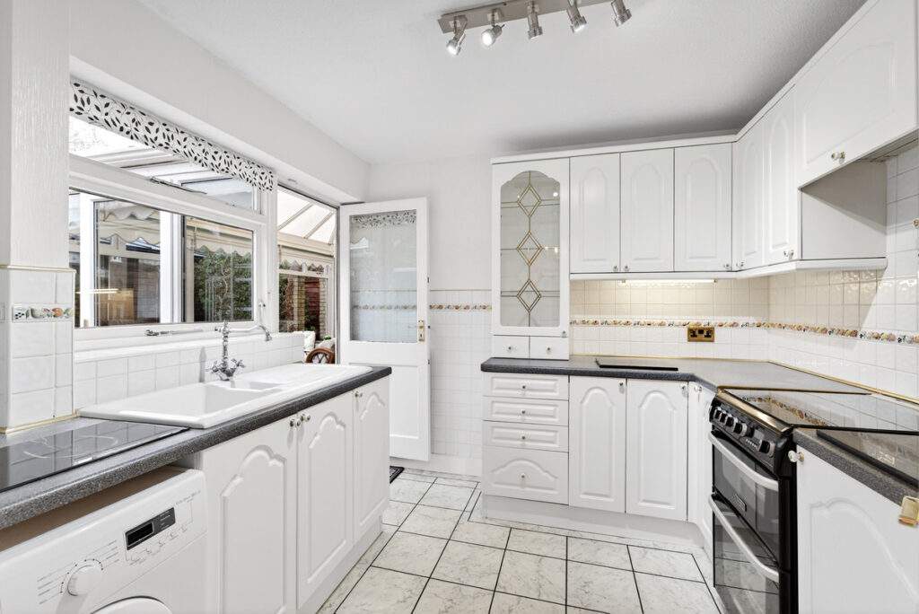 The kitchen has adequate storage and is a timeless design with white wall and base units with contrasting worktops over, space for a gas cooker and integrated fridge freezer and washing machine. Ceramic sink.
