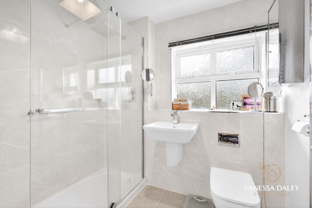 The family bathroom has been modernised and has a double walk in shower with rain soaker shower, WC with concealed cistern and floating sink.