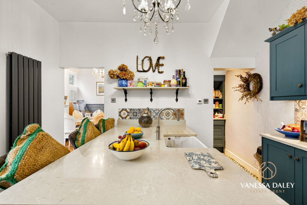 With an open archway to the kitchen, the space feels open yet still maintains the separate zoned areas. Individually designed and especially great for budding chefs this space has been designed to perfection with a central island with quartz Quartz worktop / island unit used as a breakfast bar with Quooker tap and water filter and Belfast sink. Additionally there is a superbly useful pantry in the corner. Built in appliances include a gas cooker, fridge freezer, washer dryer and dishwasher. Attractively decorated to bring the space to life and tiled floor.