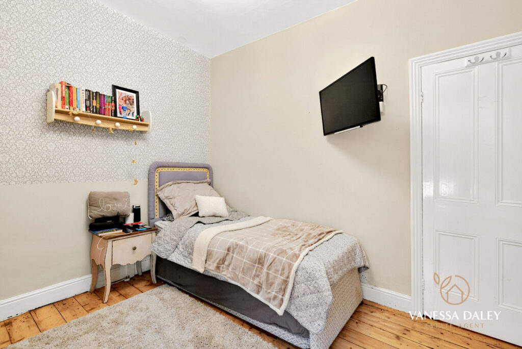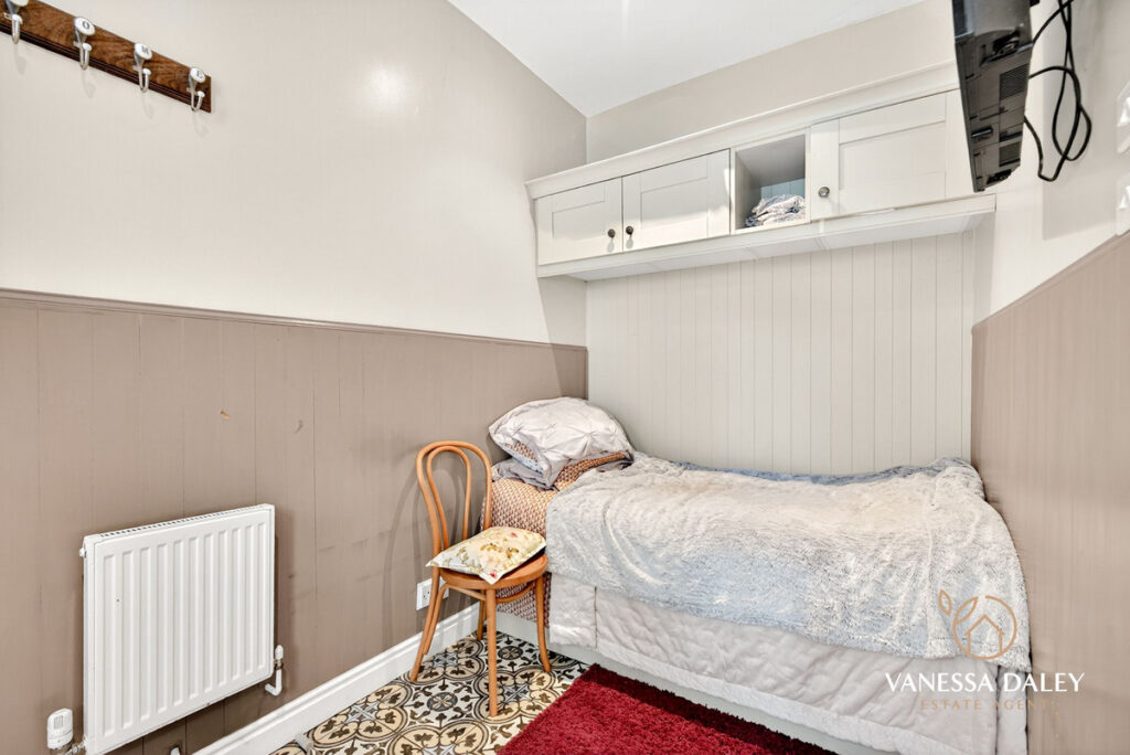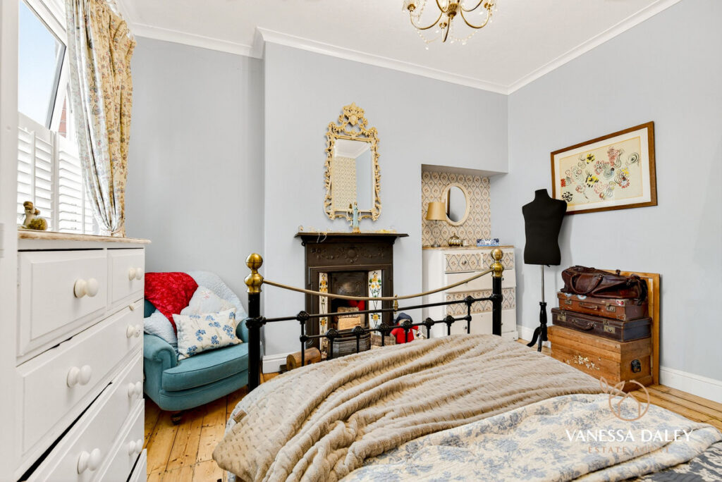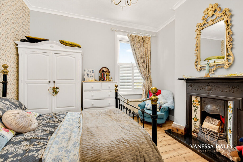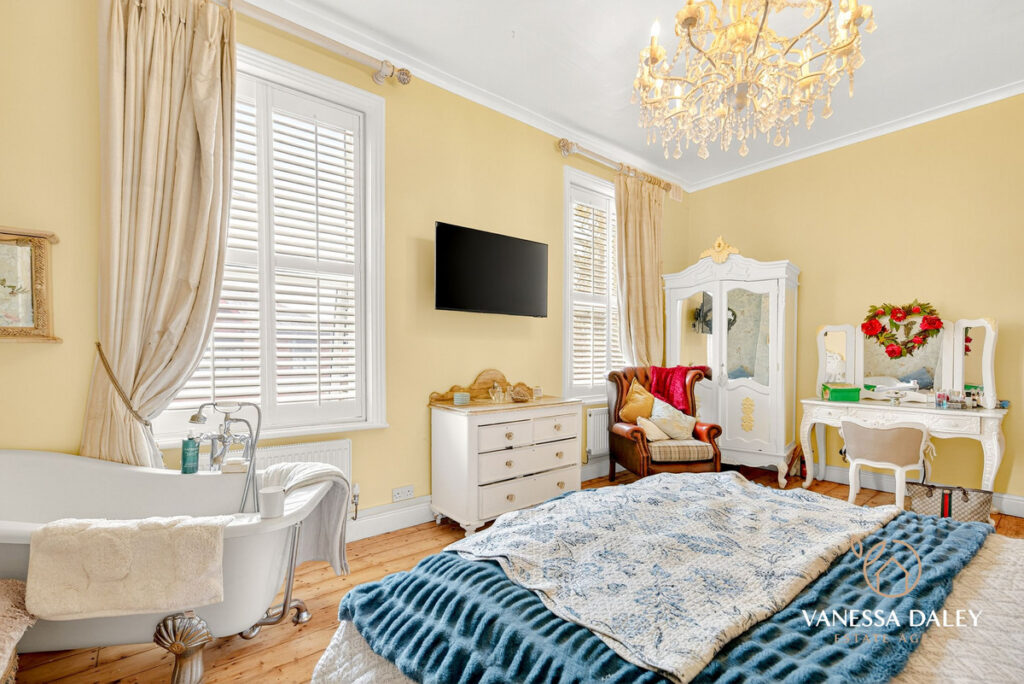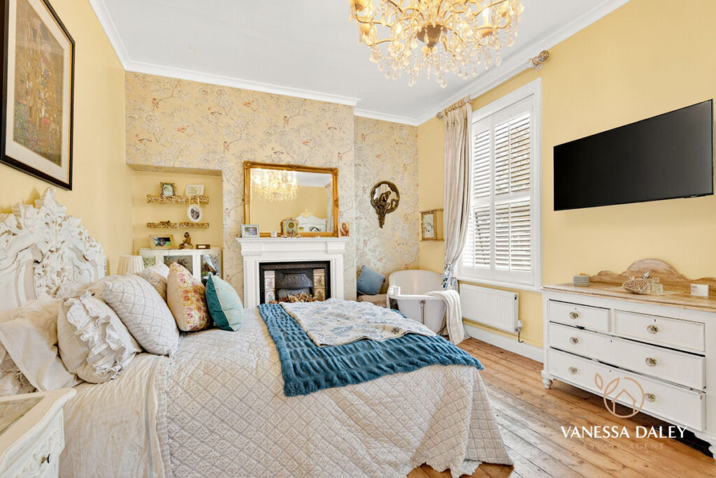 All of the bedrooms to the first floor are spread out with a split level landing enhancing the space. My favourite spot is the master bedroom which was formerly two bedrooms (and easily changeable if needed) and now is a super sized space with two windows to the front elevation with fitted shutter blinds and working fireplace with wooden surround, stripped original flooring and a roll top bath. The owners Renaissance inspired furniture brings the room to life and gives it a chic boutique hotel suite ambience.