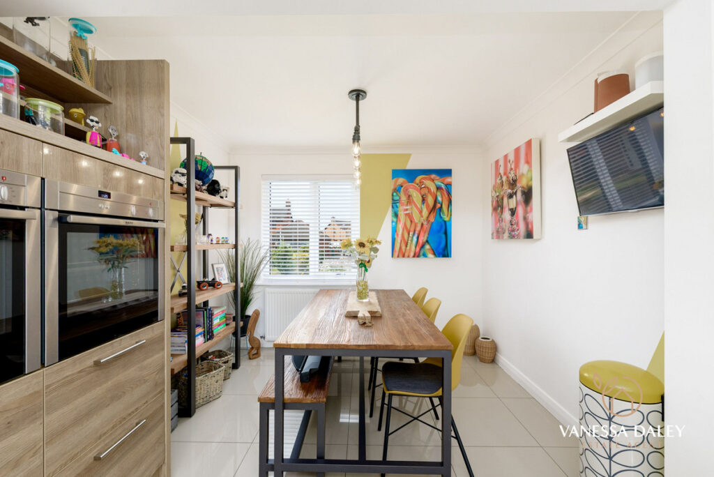 I love how the kitchen is filled with such an excellent range of wall and base units in a timeless high gloss neutral tone with wooden worktops to contrast and high shine tiled flooring which compliments beautifully. There’s a handy breakfast bar with seating for informal dining, yet this room is open plan to a dining area with ample space to accommodate a large table and chairs. From the dining area there is a window to the front aspect bringing in natural daylight. There are some integrated appliances to include two waist height ovens. a gas hob with extractor over and dishwasher. Ample space for an American style fridge freezer and plumbing for a washing machine. An open archway, leads into the Orangery.
