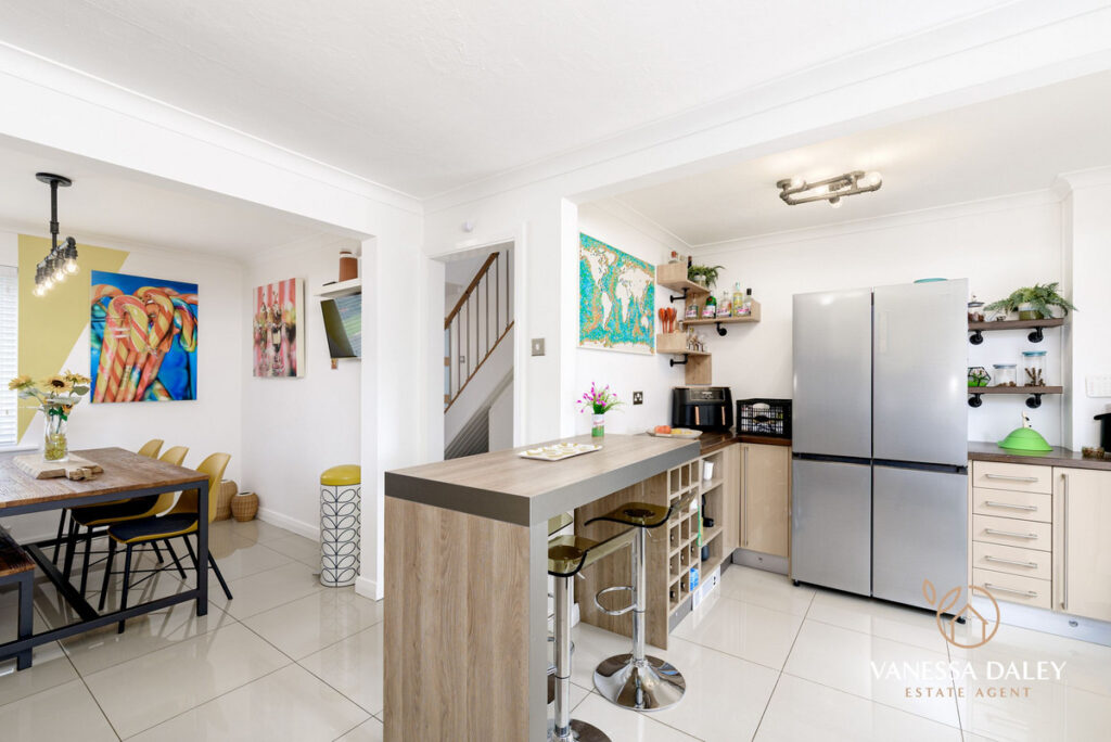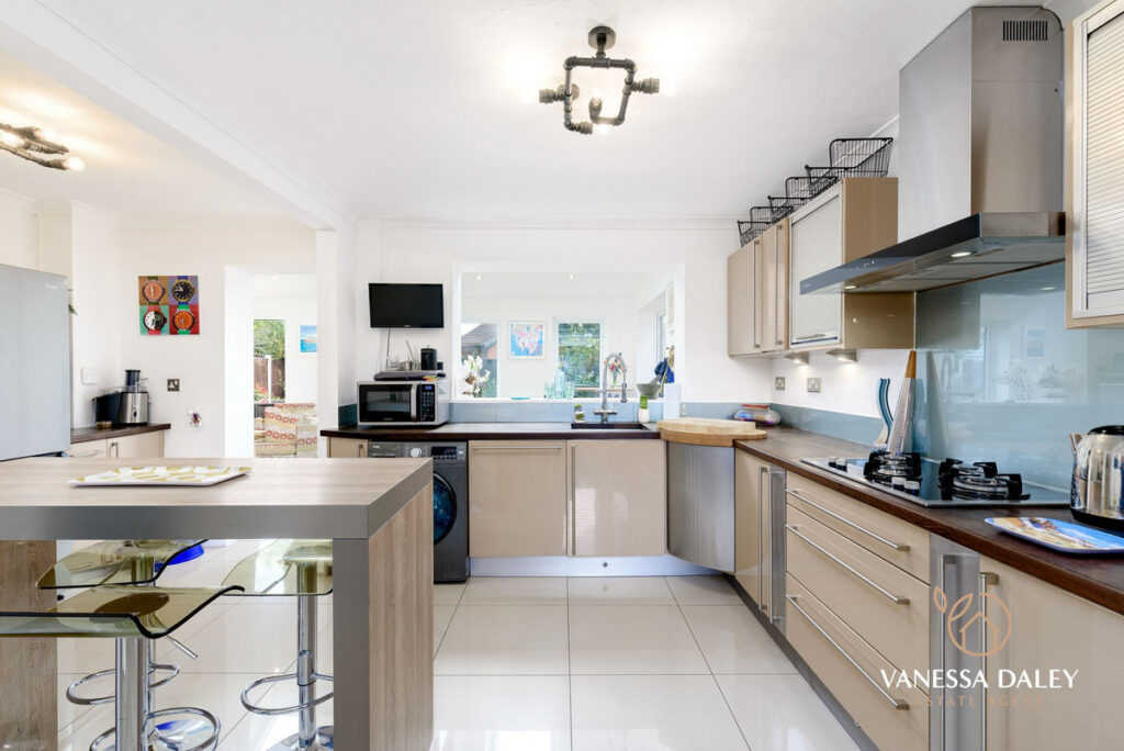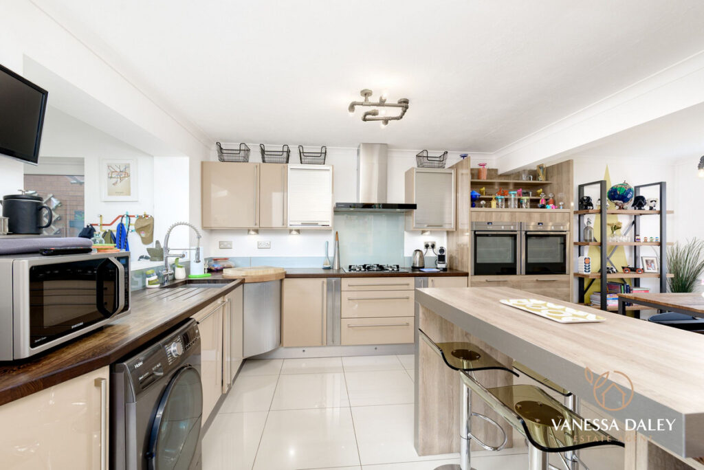 I love how the kitchen is filled with such an excellent range of wall and base units in a timeless high gloss neutral tone with wooden worktops to contrast and high shine tiled flooring which compliments beautifully. There’s a handy breakfast bar with seating for informal dining, yet this room is open plan to a dining area with ample space to accommodate a large table and chairs. From the dining area there is a window to the front aspect bringing in natural daylight. There are some integrated appliances to include two waist height ovens. a gas hob with extractor over and dishwasher. Ample space for an American style fridge freezer and plumbing for a washing machine. An open archway, leads into the Orangery.