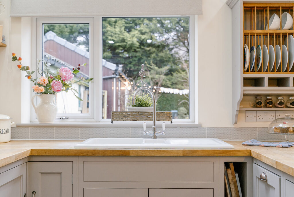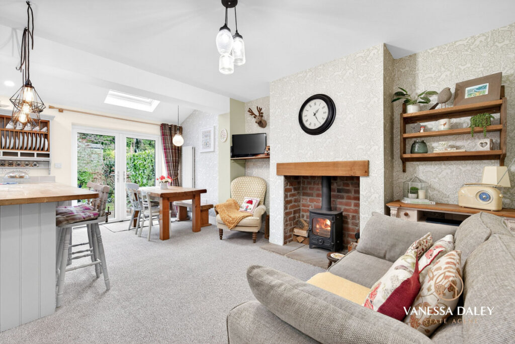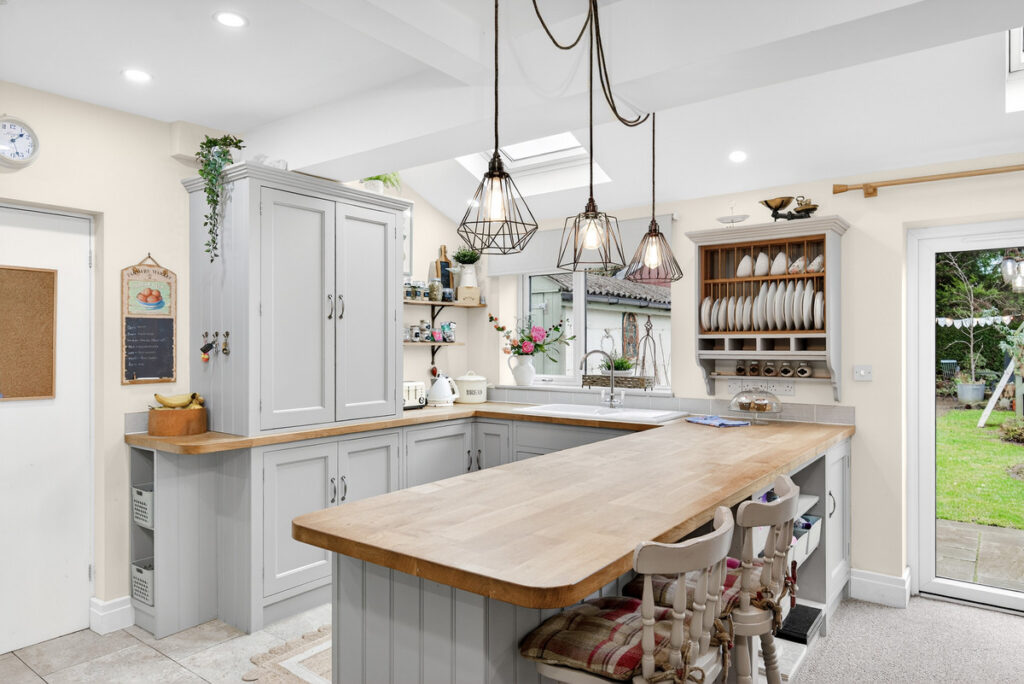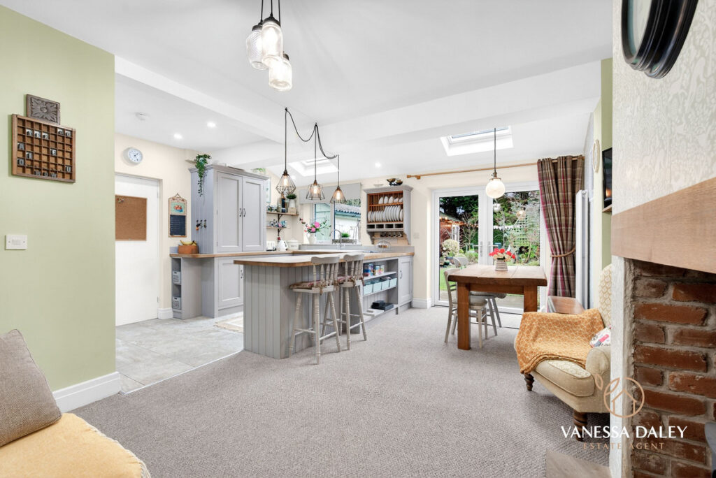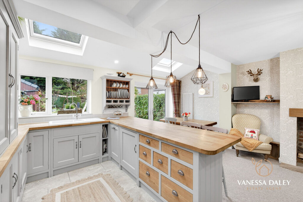 Throughout this home the current owners style is chic and elegant with a modern twist and enhances the unique 1930’s character of the home. The traditional layout of hallway with two large reception rooms has been enhanced beautifully by opening up the 2nd reception and extending outwards and sideways across the full width. This creates an incredible family living space with an open fireplace with log burner, dining space and living room with French doors to the garden. The completely bepoke solid wood kitchen is a chefs dream built and designed to last the test of time with a timeless design. The centre island is deep enough to cook and entertain and with the soft downlights to add a cosy ambience to the room. With fitted range cooker and appliances to include fridge freezer, dishwasher and a walk in pantry cupboard, the kitchen is complete. Velux windows allow lots of natural light into the space too.