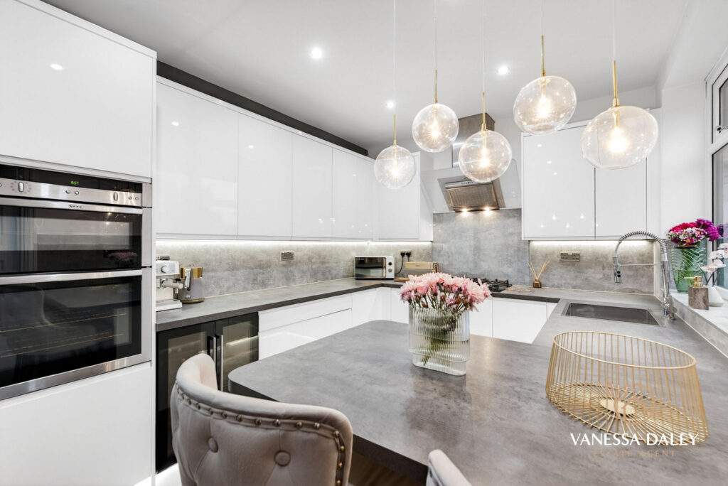 The kitchen has an ideal layout for inviting friends around, there is a breakfast bar with pendant downlights over. Integrated appliances to include an electric oven and gas hob, dishwasher and wine cooler. There is ample space for an American style fridge freezer.