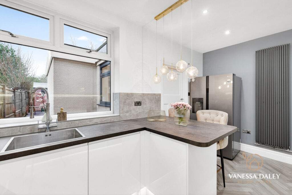 The entrance vestibule is compact with stairs leading to the first floor and a door giving access to the living room, one of two beautifully presented rooms. This is is carpeted and cosy with a gas living flame fire with contemporary surround and is a bright room with outlooks over the front hedge enclosed garden. From here a door leads you into a stylish luxuriously appointed breakfast kitchen.