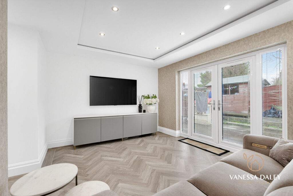 Karn Dean herringbone flooring goes beautifully with the cashmere wall and base units and a window looks to the courtyard and allows light in. A further doorway through to an inner corridor which has access to a bonus utility room and WC and then the fabulous extension which is the 2nd living room with double doors to the garden, mood lighting and herringbone patterned flooring.