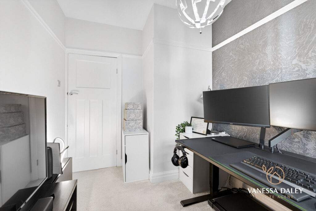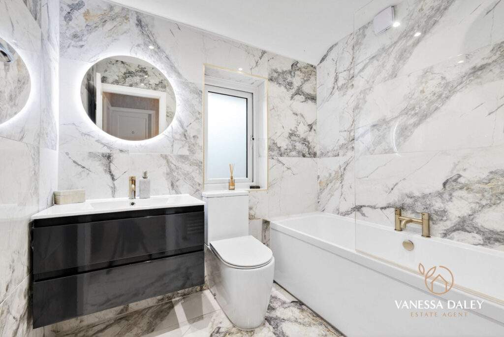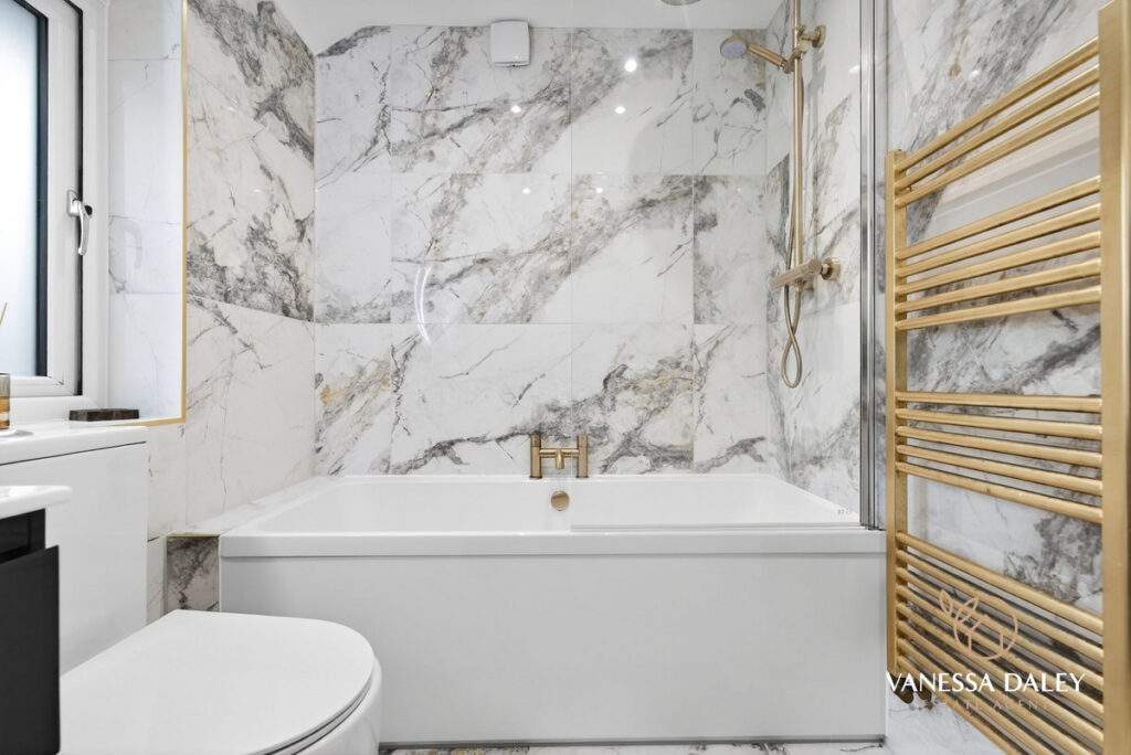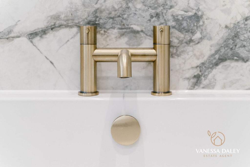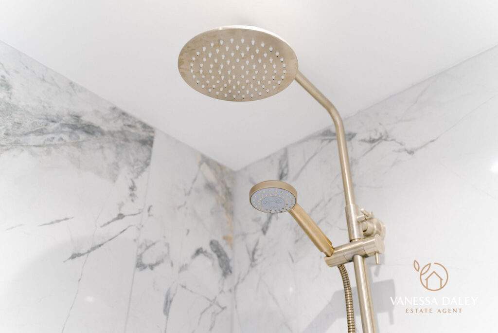 All of the bedrooms are a good size at this lovely home and the stylish bathroom completes the space and is timeless in design with marble tiling and three piece bathroom suite with gold attachments to include a rain-shower over the bath.