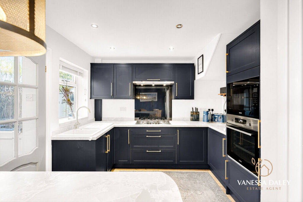 An open archway from the living room leads through to the impressive dining kitchen which has been luxuriously appointed with a shaker style navy kitchen with contrasting white worktops and practical centre island breakfast bar. Plenty of units for storage including a pull out larder and carousel and fitted appliances to include a 5 ring gas hob, waist height oven and integrated microwave. Oak flooring adds to the luxury feeling and there is ample space for a dining table to one end where patio tilt and slide doors open to the garden.