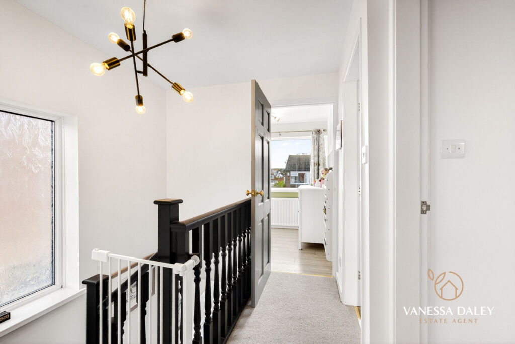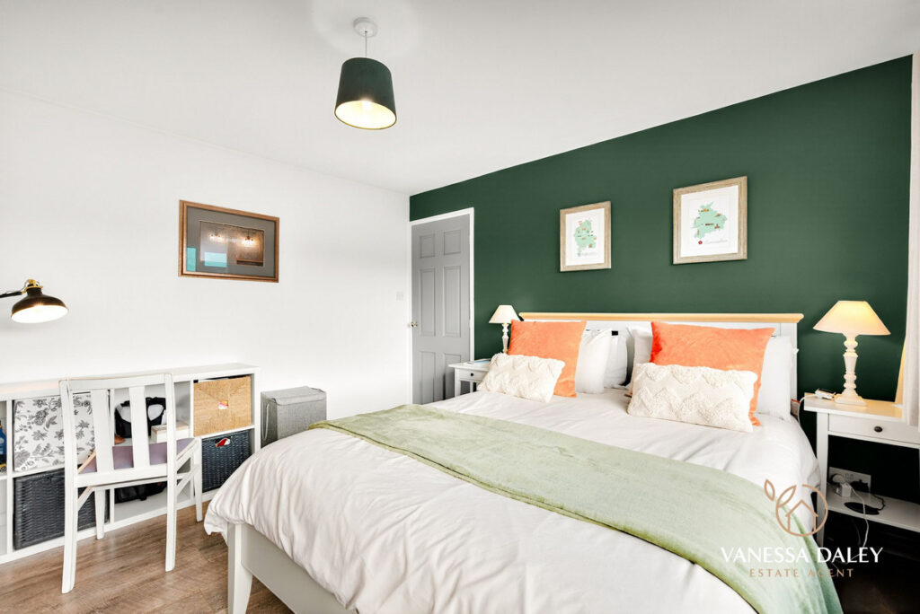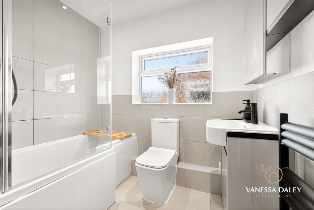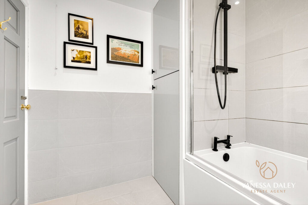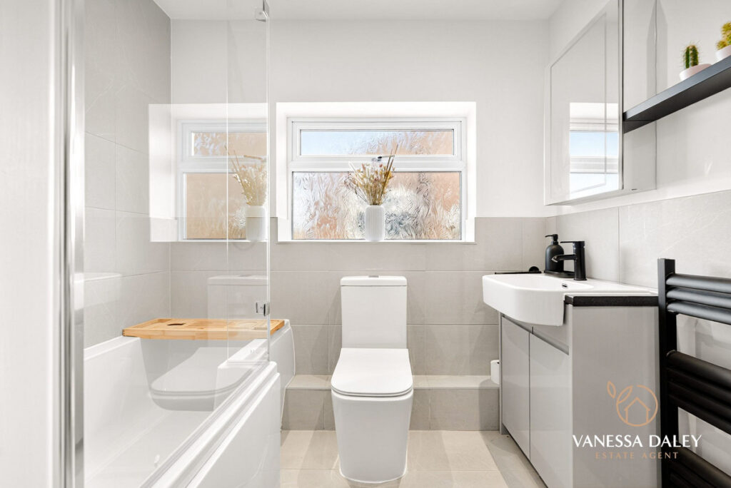 The contemporary style and immaculate finish continues to the first floor accommodation which includes 3 good sized bedrooms and a family bathroom. A white three piece bathroom suite includes a shower over the bath and a sink with convenient vanity cupboard underneath for extra storage. The black fixtures and fittings add to the modern feeling.