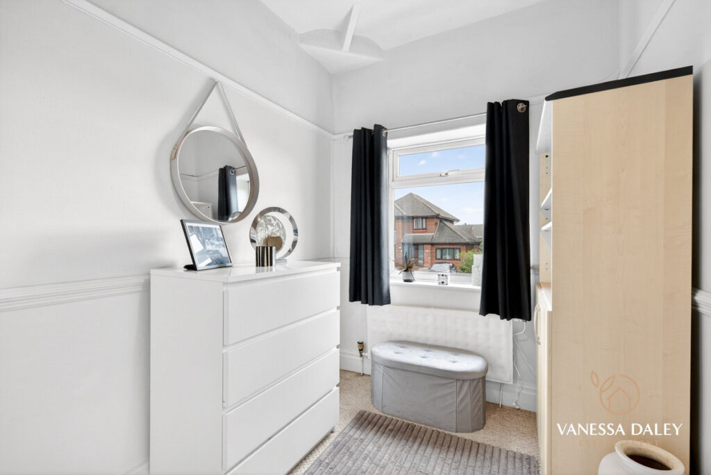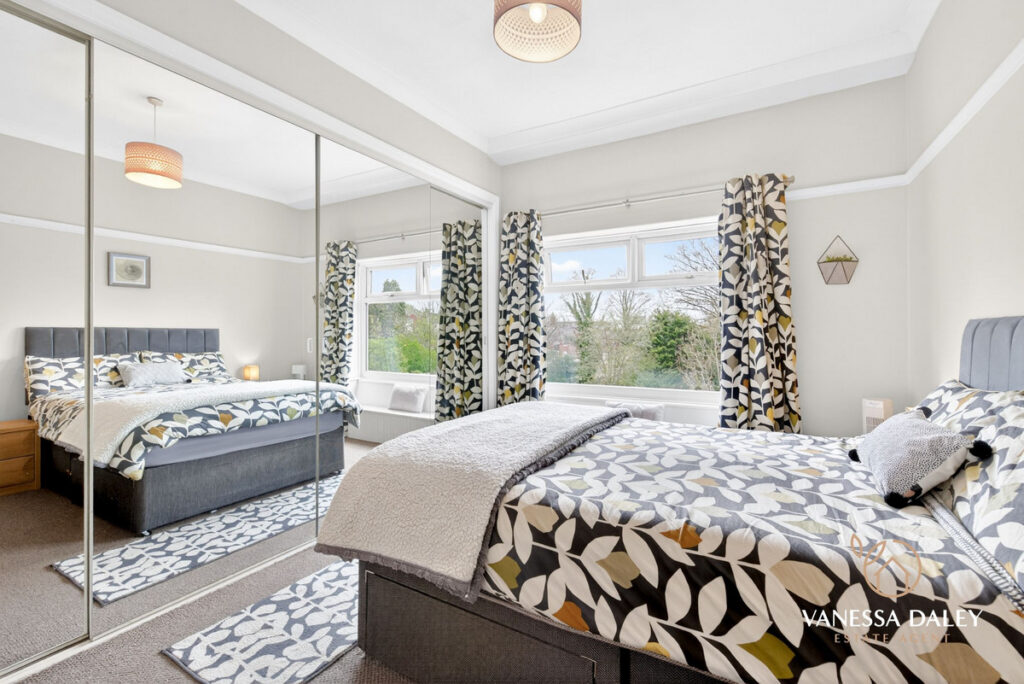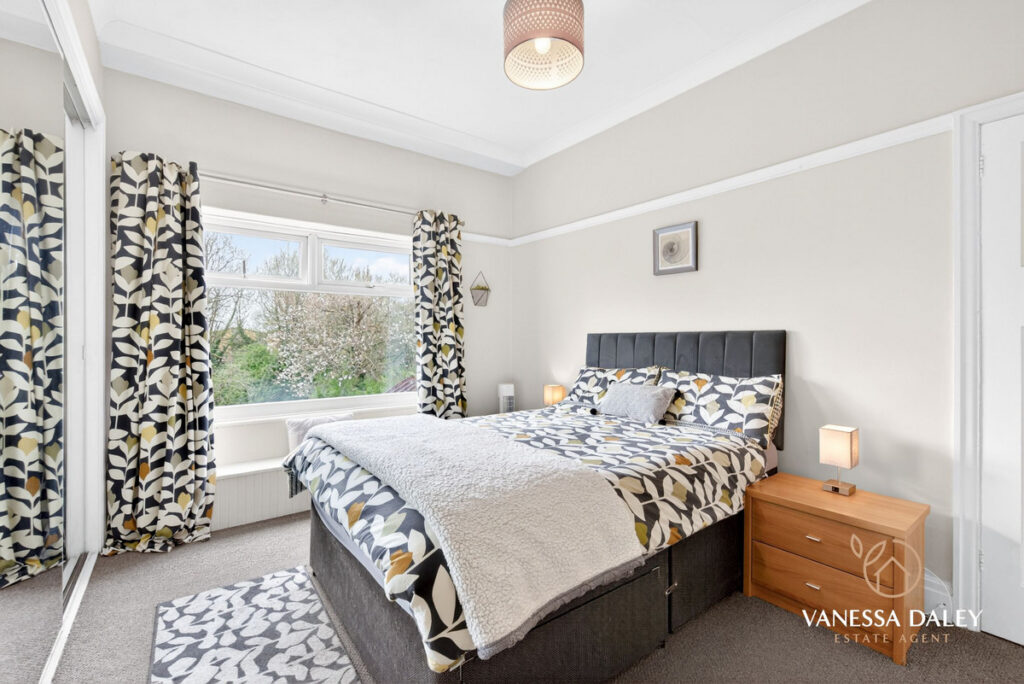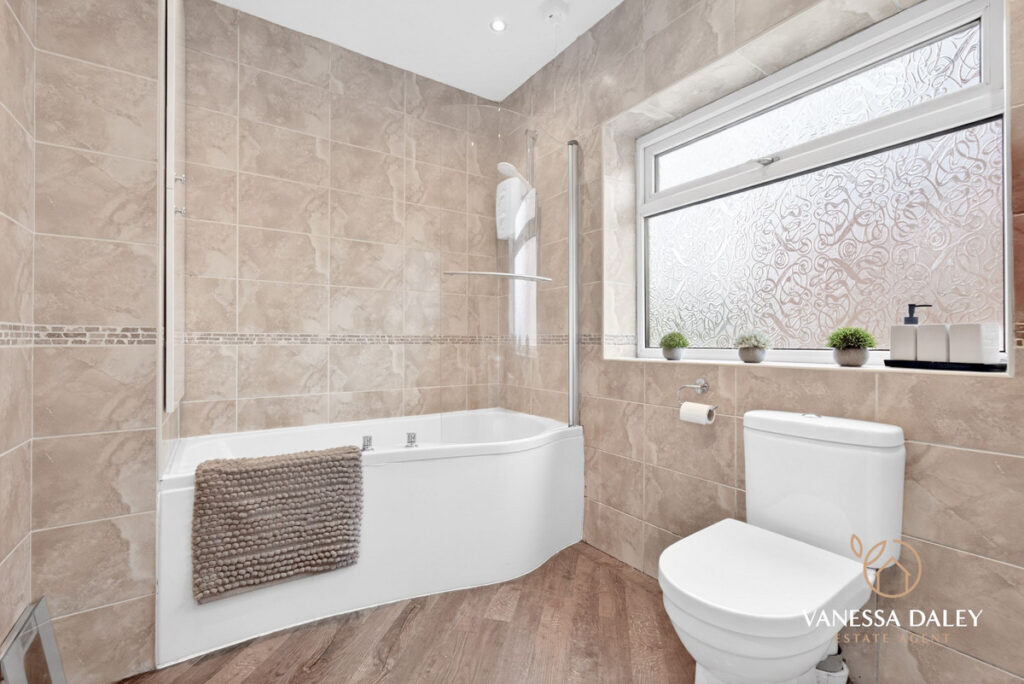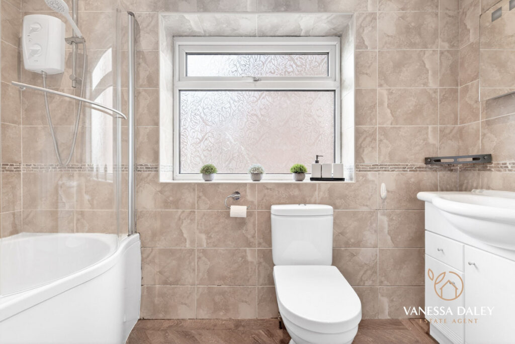 All bedrooms are tastefully presented, with the master bedroom enjoying superb views across the garden. The contemporary family bathroom completes the first floor, featuring a modern three‑piece white suite with an electric shower over the bath and a vanity unit offering practical storage.