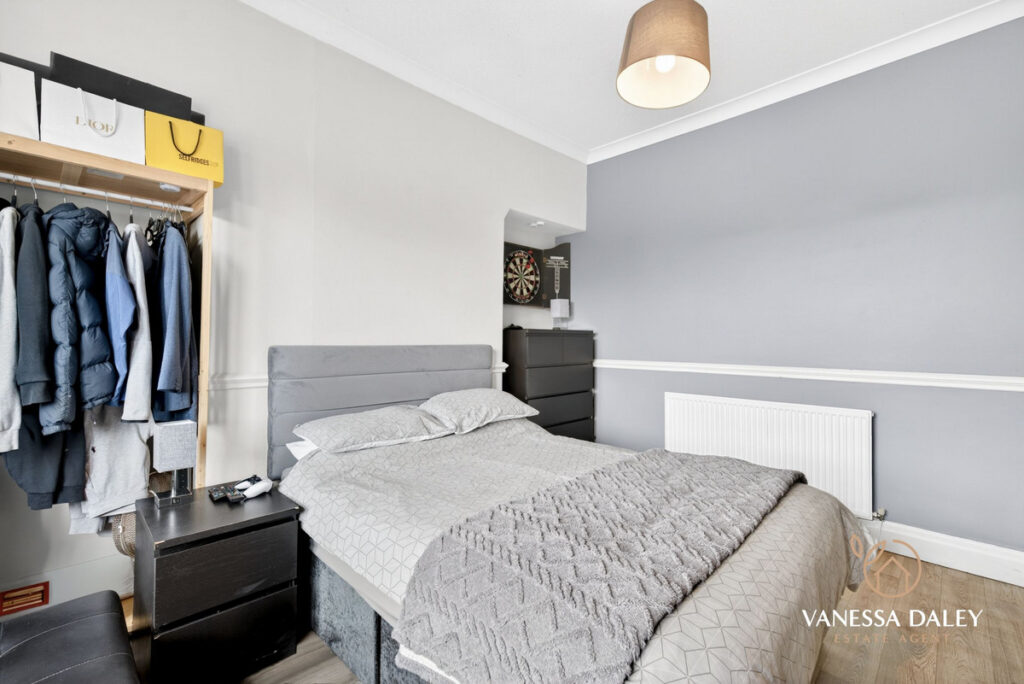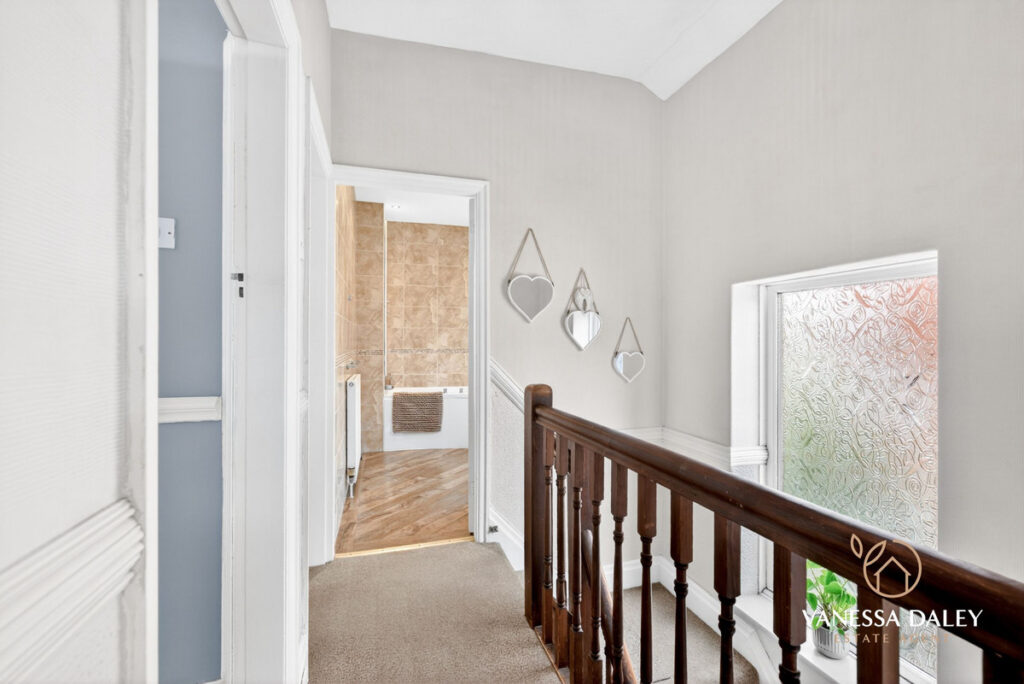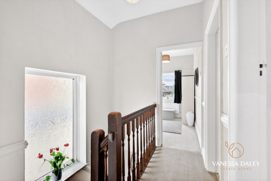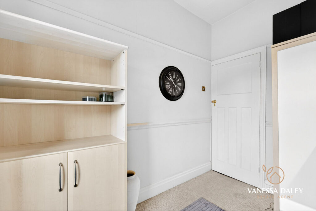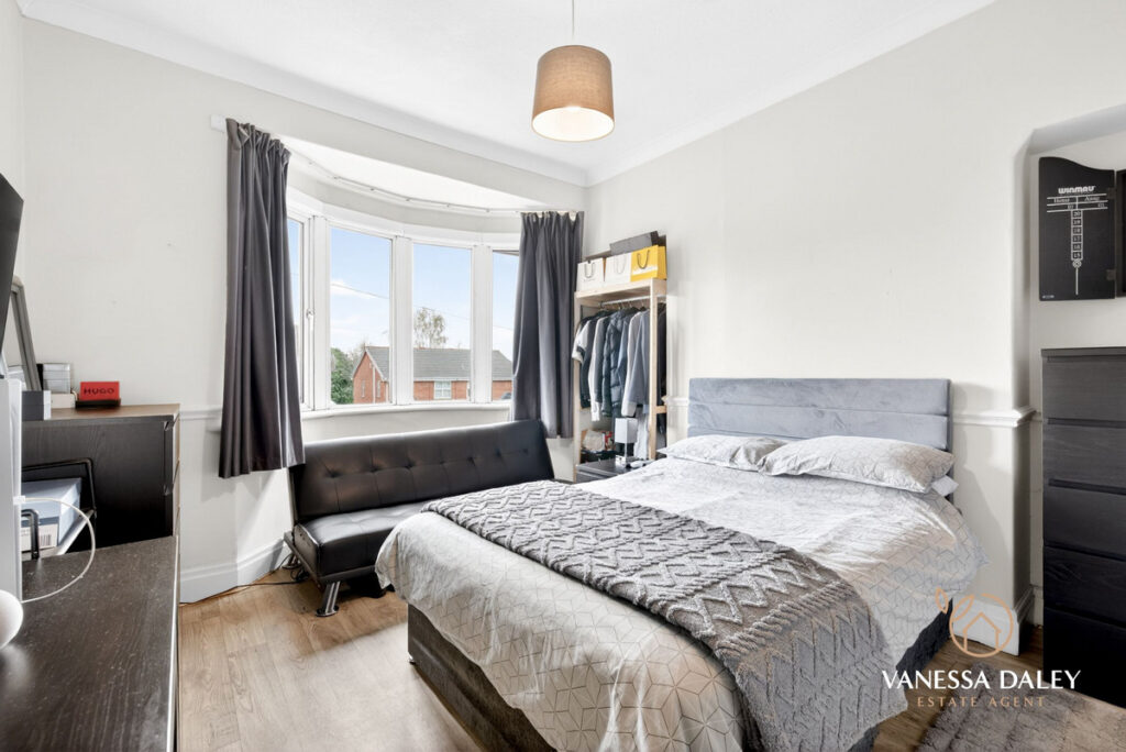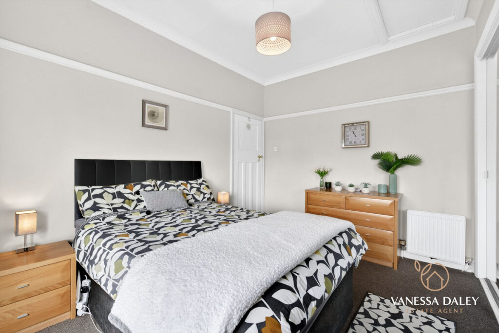 All bedrooms are tastefully presented, with the master bedroom enjoying superb views across the garden. The contemporary family bathroom completes the first floor, featuring a modern three‑piece white suite with an electric shower over the bath and a vanity unit offering practical storage.