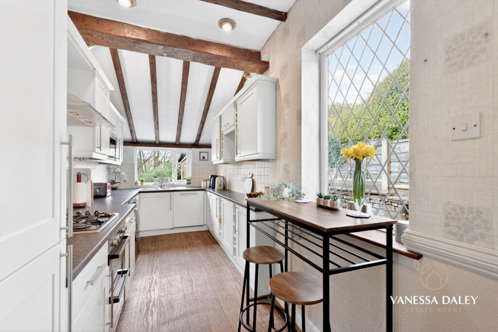 Inside, the property offers generous and well‑appointed living areas. The front reception room features an attractive bay window and is spacious enough to serve as either a family dining room or a comfortable lounge. The rear reception room enjoys abundant natural light, with patio doors opening onto the block‑paved terrace. The galley‑style breakfast kitchen also overlooks the garden and is fitted with an excellent range of wall and base units, with ample space for a breakfast area. A side door provides access to the driveway and garage.