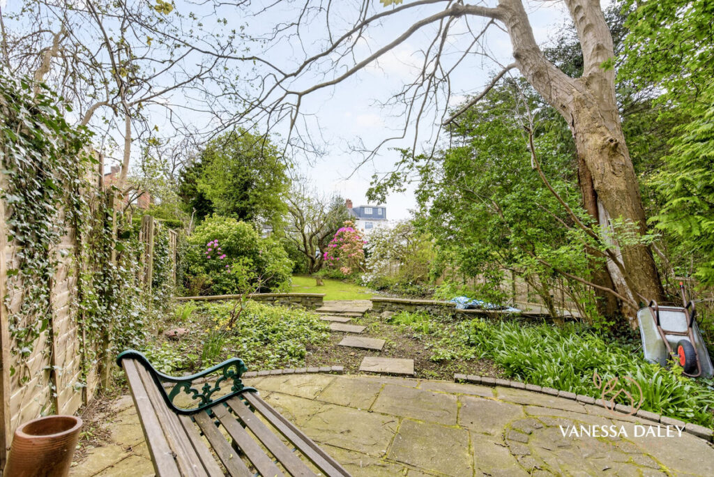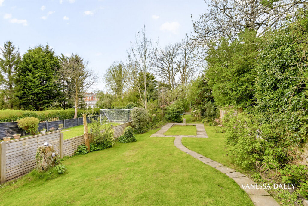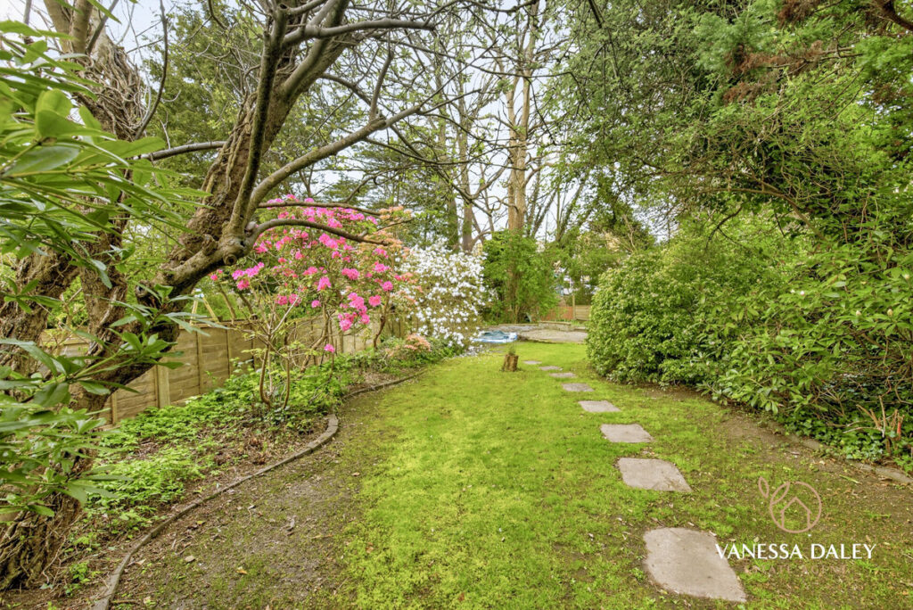 Externally, the driveway accommodates multiple vehicles, and the garage—equipped with power and lighting—offers excellent potential for conversion into a home office, gym, or hobby room. The gardens are fully enclosed, beautifully maintained, and bordered by mature trees and shrubs. At the far end, a secluded, shaded seating area provides a peaceful retreat.
